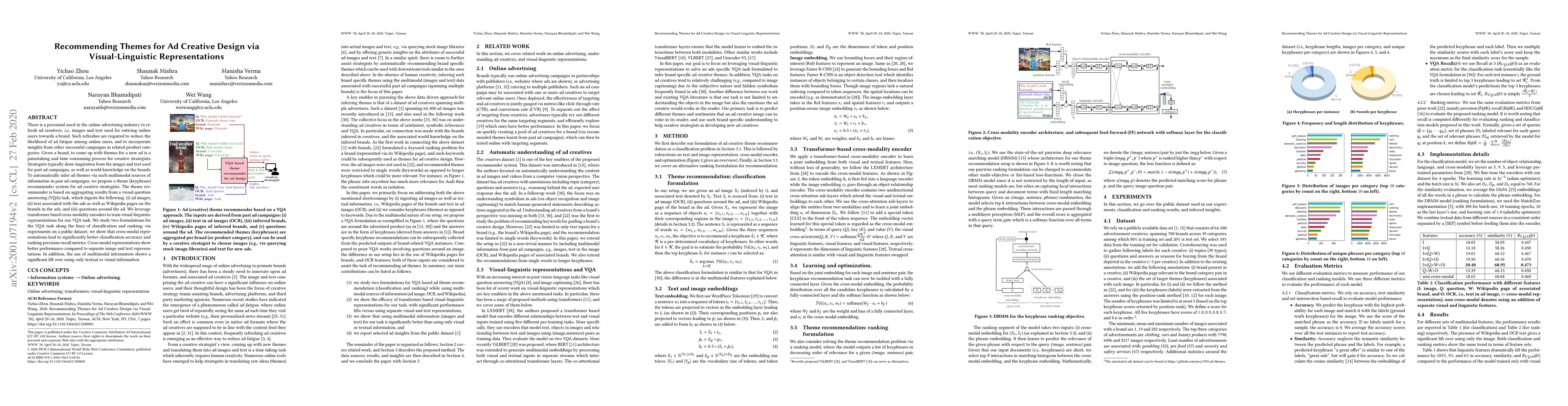 There is a perennial need in the online advertising industry to refresh ad creatives, i.e., images and text used for enticing online users towards a brand. Such refreshes are required to reduce the likelihood of ad fatigue among online users, and to incorporate insights from other successful campaigns in related product categories. Given a brand, to come up with themes for a new ad is a painstaking and time consuming process for creative strategists. Strategists typically draw inspiration from the images and text used for past ad campaigns, as well as world knowledge on the brands. To automatically infer ad themes via such multimodal sources of information in past ad campaigns, we propose a theme (keyphrase) recommender system for ad creative strategists. The theme recommender is based on aggregating results from a visual question answering (VQA) task, which ingests the following: (i) ad images, (ii) text associated with the ads as well as Wikipedia pages on the brands in the ads, and (iii) questions around the ad. We leverage transformer based cross-modality encoders to train visual-linguistic representations for our VQA task. We study two formulations for the VQA task along the lines of classification and ranking; via experiments on a public dataset, we show that cross-modal representations lead to significantly better classification accuracy and ranking precision-recall metrics. Cross-modal representations show better performance compared to separate image and text representations. In addition, the use of multimodal information shows a significant lift over using only textual or visual information.
