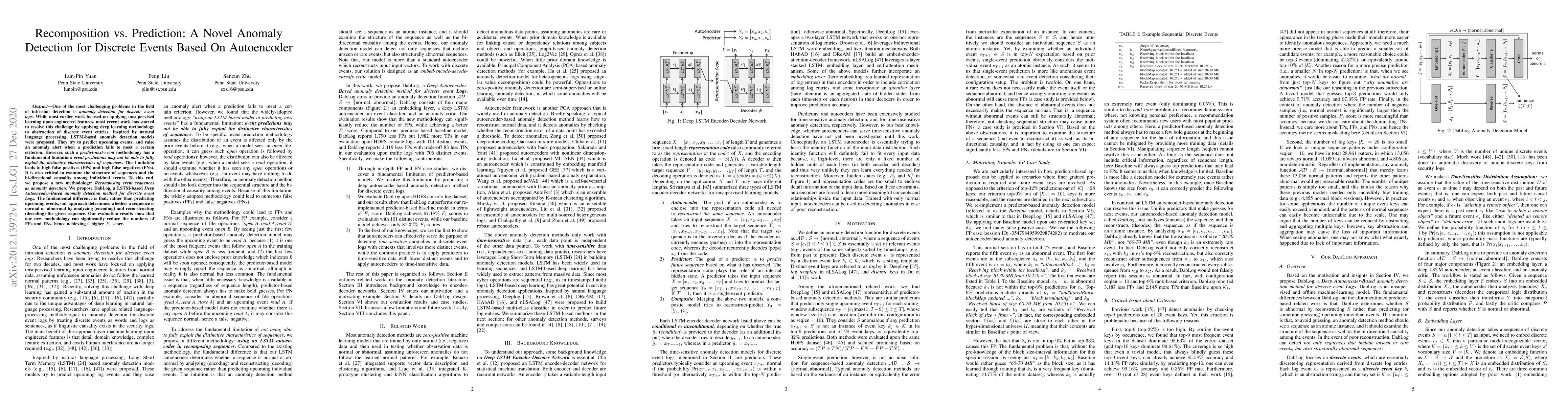 This paper proposes DabLog, a novel anomaly detection method for discrete event logs using deep autoencoders, which recomposes event sequences rather than predicting upcoming events to better capture sequence structure and bi-directional causality. The method shows improved performance with fewer false positives and negatives compared to prediction-based models.