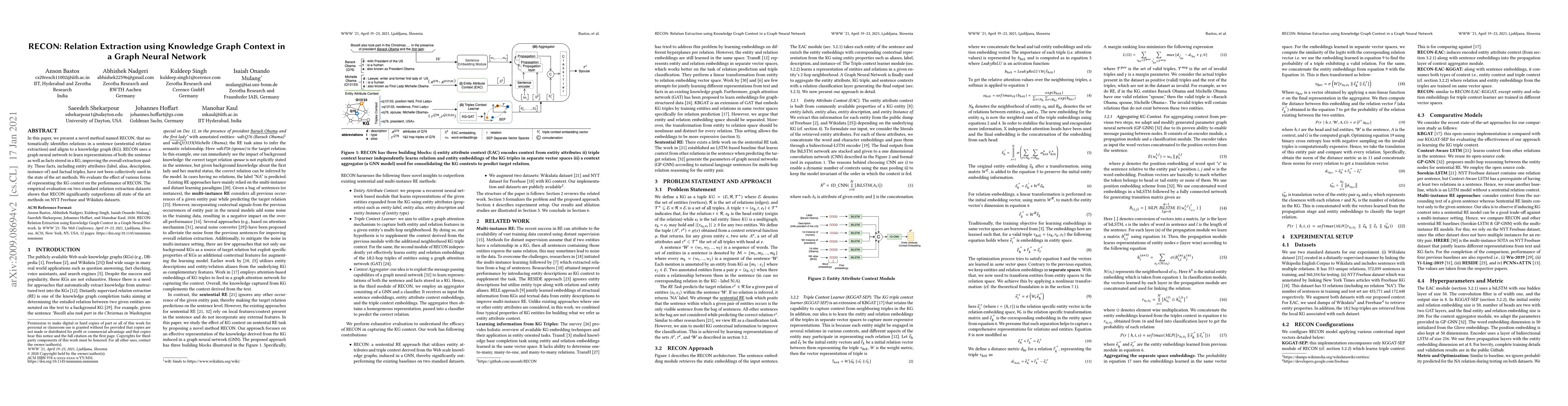 In this paper, we present a novel method named RECON, that automatically identifies relations in a sentence (sentential relation extraction) and aligns to a knowledge graph (KG). RECON uses a graph neural network to learn representations of both the sentence as well as facts stored in a KG, improving the overall extraction quality. These facts, including entity attributes (label, alias, description, instance-of) and factual triples, have not been collectively used in the state of the art methods. We evaluate the effect of various forms of representing the KG context on the performance of RECON. The empirical evaluation on two standard relation extraction datasets shows that RECON significantly outperforms all state of the art methods on NYT Freebase and Wikidata datasets. RECON reports 87.23 F1 score (Vs 82.29 baseline) on Wikidata dataset whereas on NYT Freebase, reported values are 87.5(P@10) and 74.1(P@30) compared to the previous baseline scores of 81.3(P@10) and 63.1(P@30).