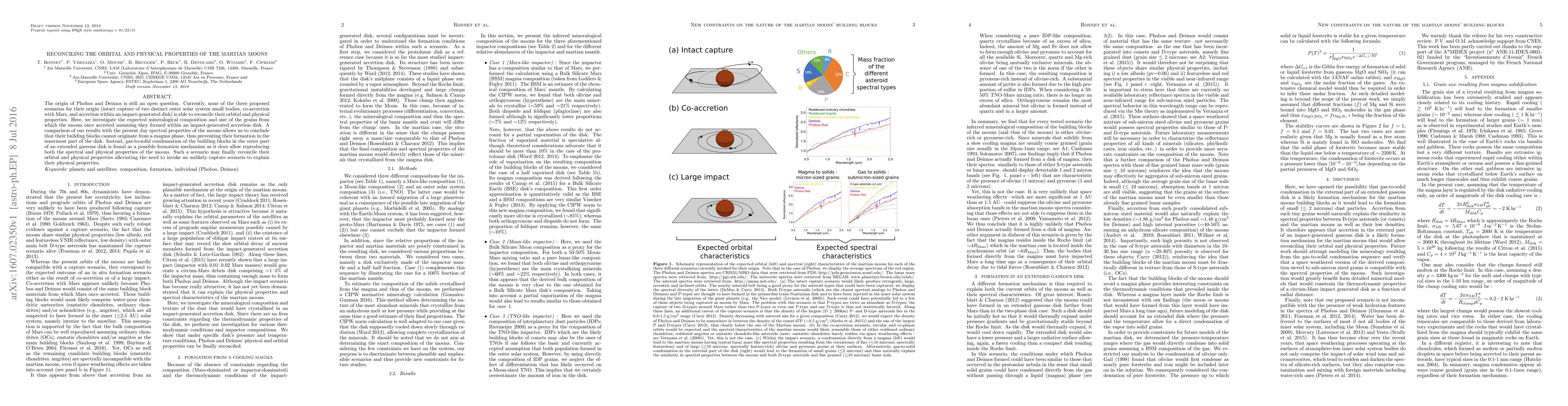 This paper investigates the formation of Martian moons Phobos and Deimos, proposing that their building blocks likely formed via gas-to-solid condensation in the outer part of an extended gaseous disk, rather than a magma phase, thus reconciling their spectral and physical properties without requiring an unlikely capture scenario.