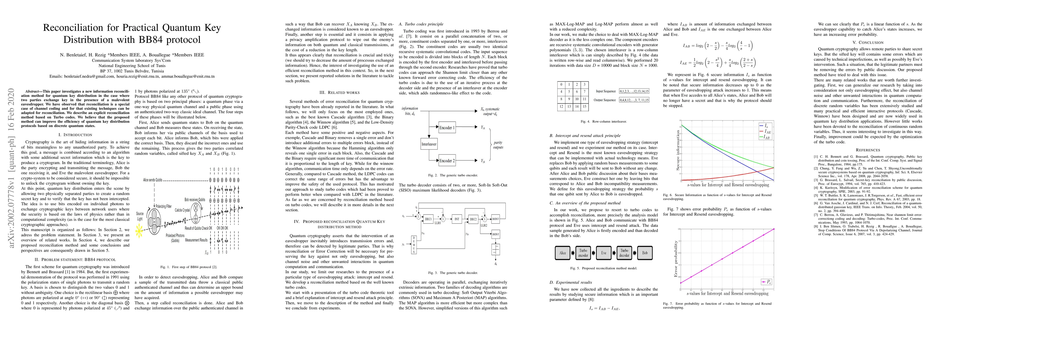This paper proposes a new reconciliation method for quantum key distribution using the BB84 protocol, adapting existing Turbo code techniques to enhance efficiency in the presence of an eavesdropper. The method aims to improve the practical implementation of quantum key distribution protocols.