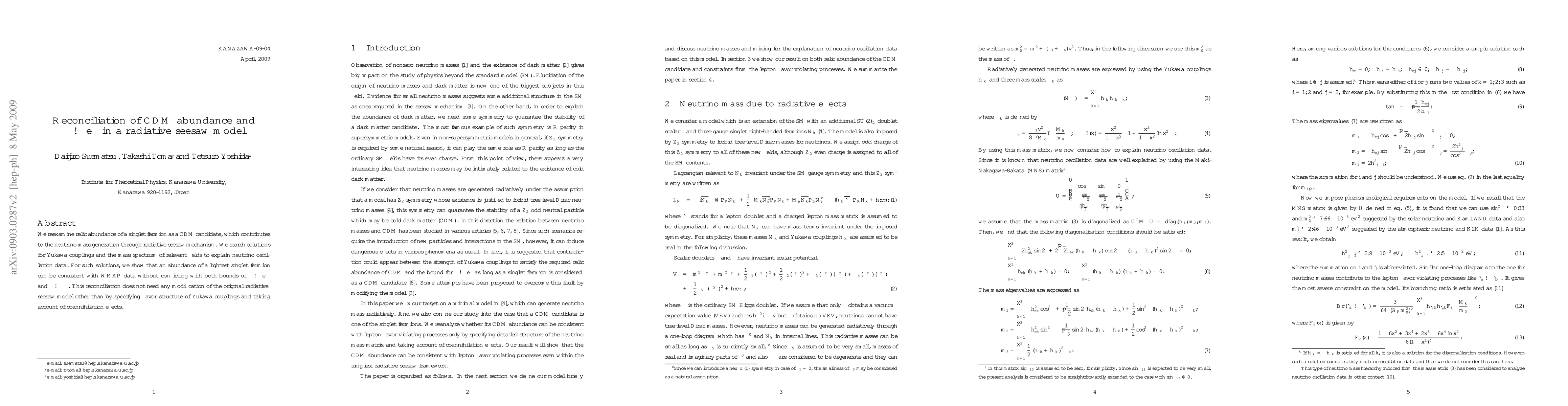 This paper explores a singlet fermion as a candidate for dark matter (CDM) in a radiative seesaw model, aiming to reconcile its relic abundance with WMAP data. It finds solutions for Yukawa couplings that align with neutrino oscillation data while ensuring the fermion's abundance does not conflict with $\mu\to e\gamma$ and $\tau\to \mu\gamma$ decay constraints.