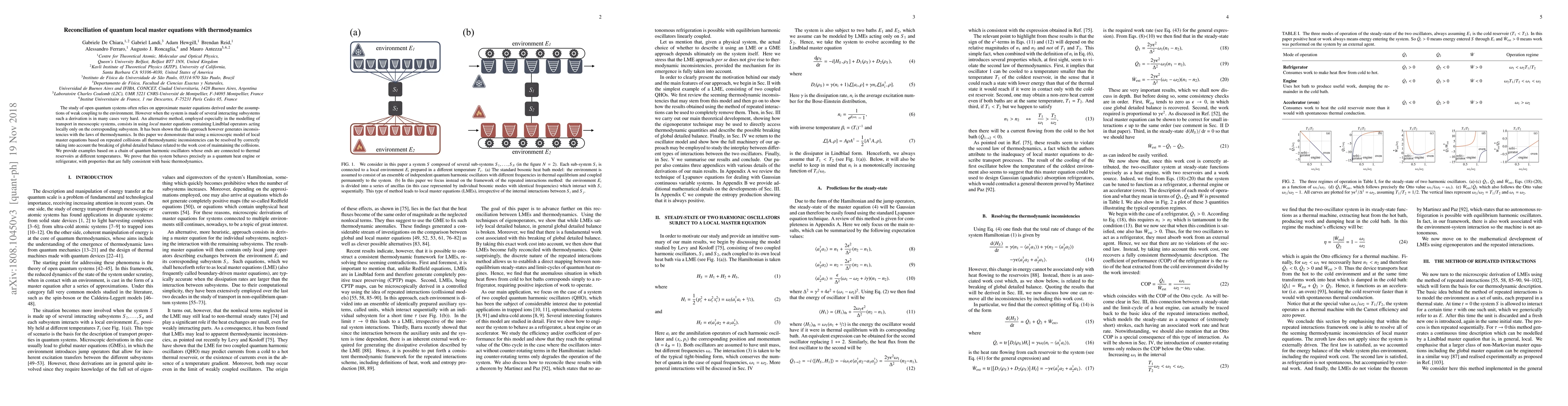 This paper resolves inconsistencies between quantum local master equations and thermodynamics by modeling them through repeated collisions. It proves that this approach, applied to a quantum harmonic oscillator chain with temperature differences, behaves as a quantum heat engine or refrigerator, aligning with basic thermodynamics principles.