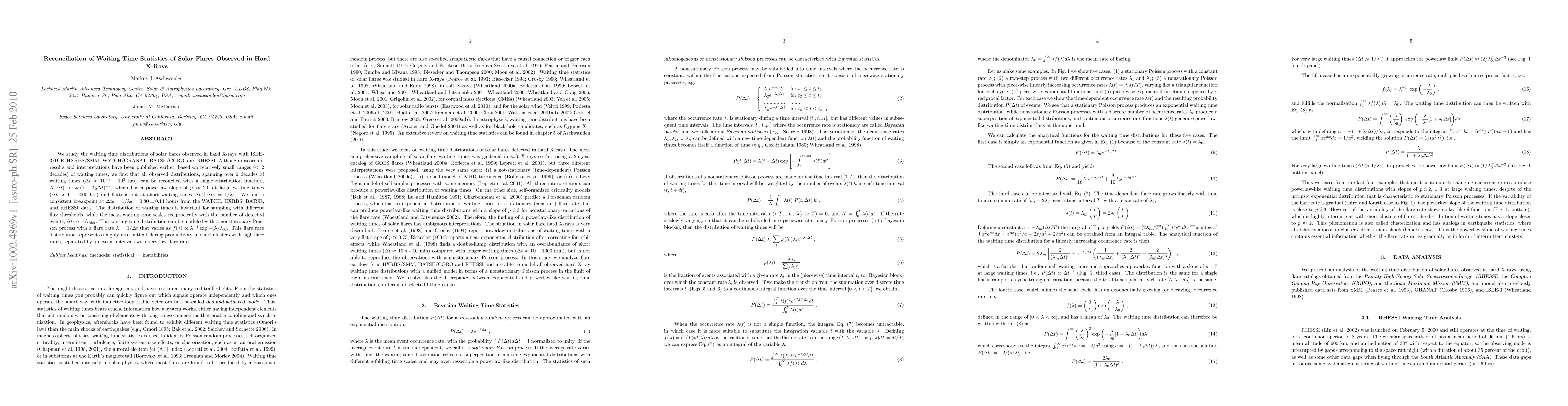 We study the waiting time distributions of solar flares observed in hard X-rays with ISEE-3/ICE, HXRBS/SMM, WATCH/GRANAT, BATSE/CGRO, and RHESSI. Although discordant results and interpretations have been published earlier, based on relatively small ranges ($< 2$ decades) of waiting times, we find that all observed distributions, spanning over 6 decades of waiting times ($\Delta t \approx 10^{-3}- 10^3$ hrs), can be reconciled with a single distribution function, $N(\Delta t) \propto \lambda_0 (1 + \lambda_0 \Delta t)^{-2}$, which has a powerlaw slope of $p \approx 2.0$ at large waiting times ($\Delta t \approx 1-1000$ hrs) and flattens out at short waiting times $\Delta t \lapprox \Delta t_0 = 1/\lambda_0$. We find a consistent breakpoint at $\Delta t_0 = 1/\lambda_0 = 0.80\pm0.14$ hours from the WATCH, HXRBS, BATSE, and RHESSI data. The distribution of waiting times is invariant for sampling with different flux thresholds, while the mean waiting time scales reciprocically with the number of detected events, $\Delta t_0 \propto 1/n_{det}$. This waiting time distribution can be modeled with a nonstationary Poisson process with a flare rate $\lambda=1/\Delta t$ that varies as $f(\lambda) \propto \lambda^{-1} \exp{-(\lambda/\lambda_0)}$. This flare rate distribution represents a highly intermittent flaring productivity in short clusters with high flare rates, separated by quiescent intervals with very low flare rates.
