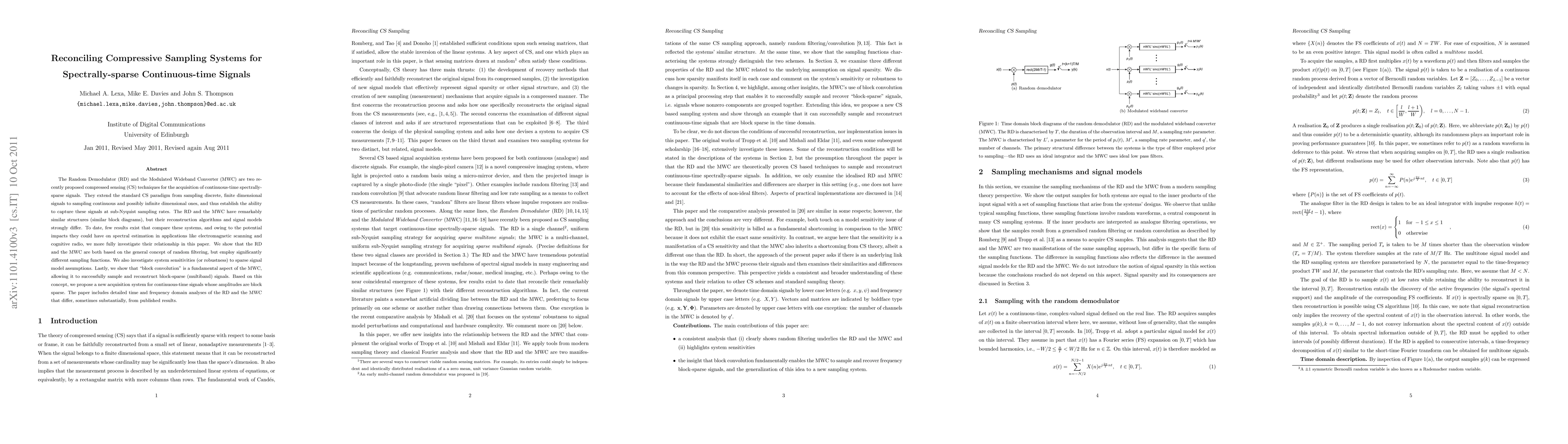 This paper compares the Random Demodulator (RD) and Modulated Wideband Converter (MWC) compressed sensing techniques for acquiring continuous-time spectrally-sparse signals, revealing their similarities and differences in reconstruction algorithms and signal models. It proposes a new acquisition system based on "block convolution" for block-sparse signals, providing detailed analyses that differ from previous studies.
