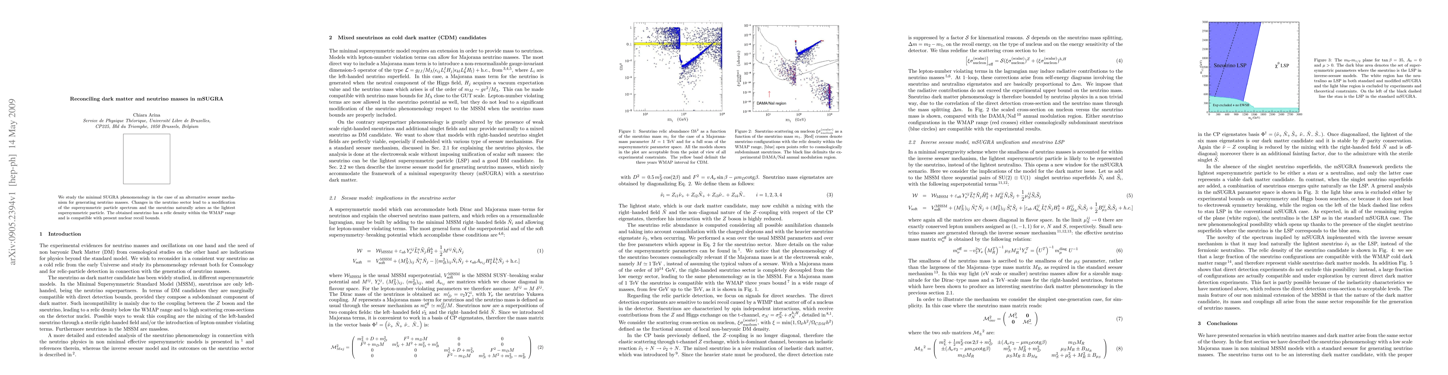 We study the minimal SUGRA phenomenology in the case of an alternative seesaw mechanism for generating neutrino masses. Changes in the neutrino sector lead to a modification of the supersymmetric particle spectrum and the sneutrino naturally arises as the lightest supersymmetric particle. The obtained sneutrino has a relic density within the WMAP range and is compatible with present nuclear recoil bounds.