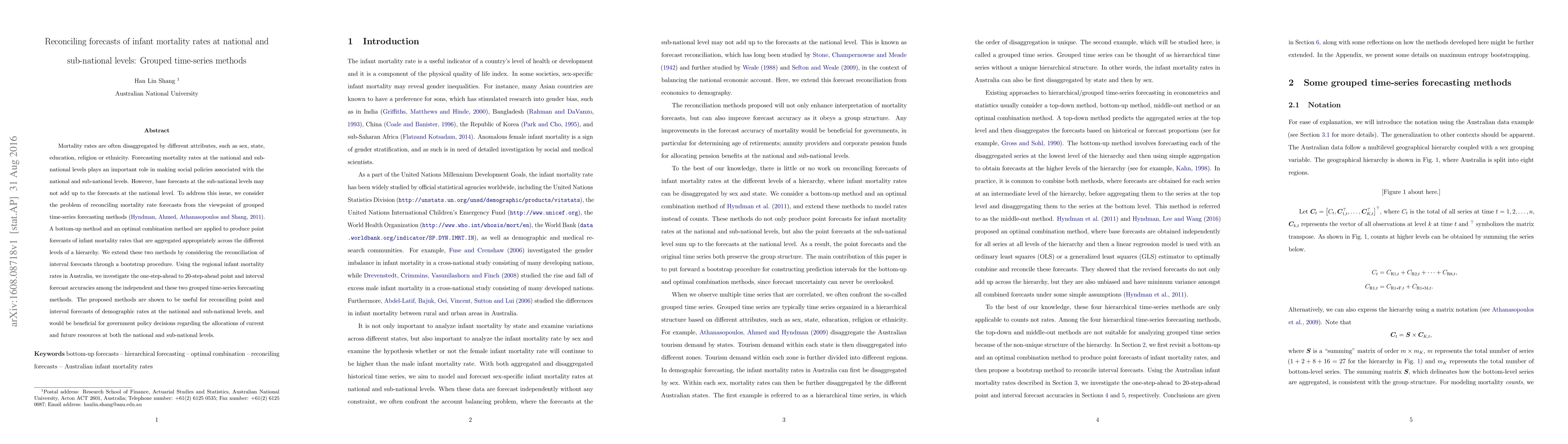 This paper proposes grouped time-series methods to reconcile infant mortality rate forecasts at national and sub-national levels, addressing discrepancies between sub-national and national forecasts. The study applies bottom-up and optimal combination methods, extending them to reconcile interval forecasts, and demonstrates their effectiveness using Australian regional data.