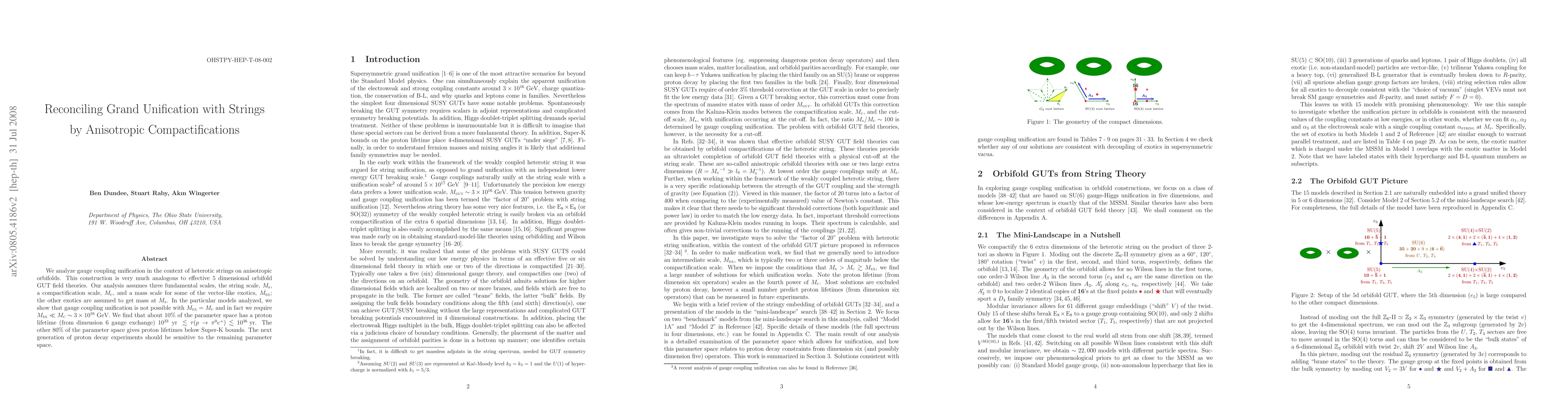 We analyze gauge coupling unification in the context of heterotic strings on anisotropic orbifolds. This construction is very much analogous to effective 5 dimensional orbifold GUT field theories. Our analysis assumes three fundamental scales, the string scale, $\mstring$, a compactification scale, $\mc$, and a mass scale for some of the vector-like exotics, $\mex$; the other exotics are assumed to get mass at $\mstring$. In the particular models analyzed, we show that gauge coupling unification is not possible with $\mex = \mc$ and in fact we require $\mex \ll \mc \sim 3 \times 10^{16}$ GeV. We find that about 10% of the parameter space has a proton lifetime (from dimension 6 gauge exchange) $10^{33} {\rm yr} \lesssim\tau(p\to \pi^0e^+) \lesssim 10^{36} {\rm yr}$. The other 80% of the parameter space gives proton lifetimes below Super-K bounds. The next generation of proton decay experiments should be sensitive to the remaining parameter space.
