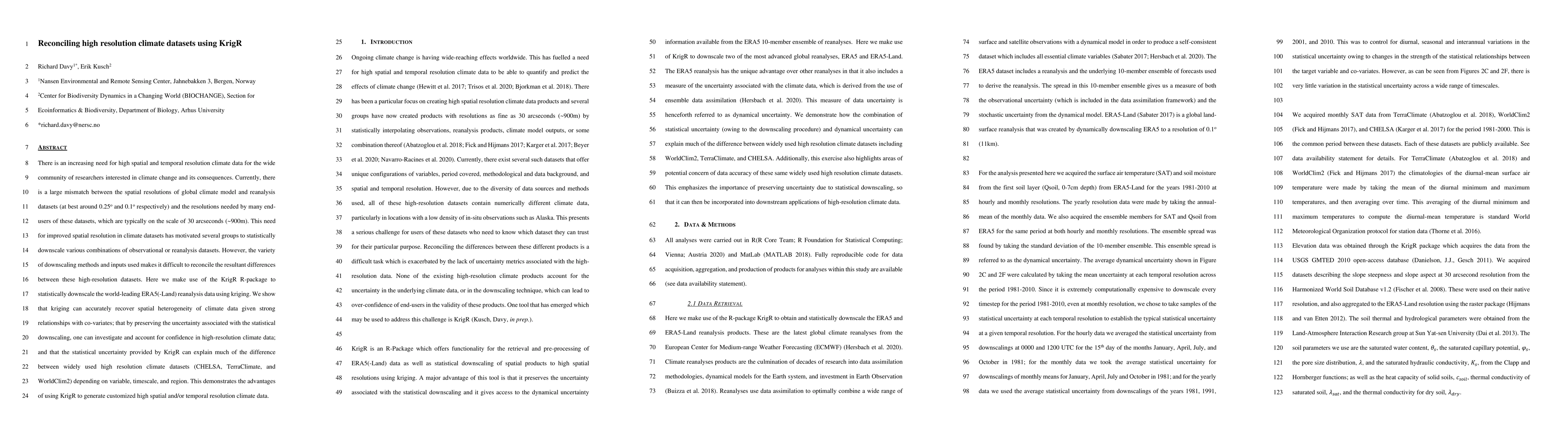 This paper uses the KrigR R-package to statistically downscale ERA5(-Land) reanalysis data, demonstrating that kriging can accurately recover spatial heterogeneity in climate data. It shows that statistical uncertainty from KrigR can help reconcile differences between high-resolution climate datasets, highlighting the method's potential to generate customized high-resolution climate data.