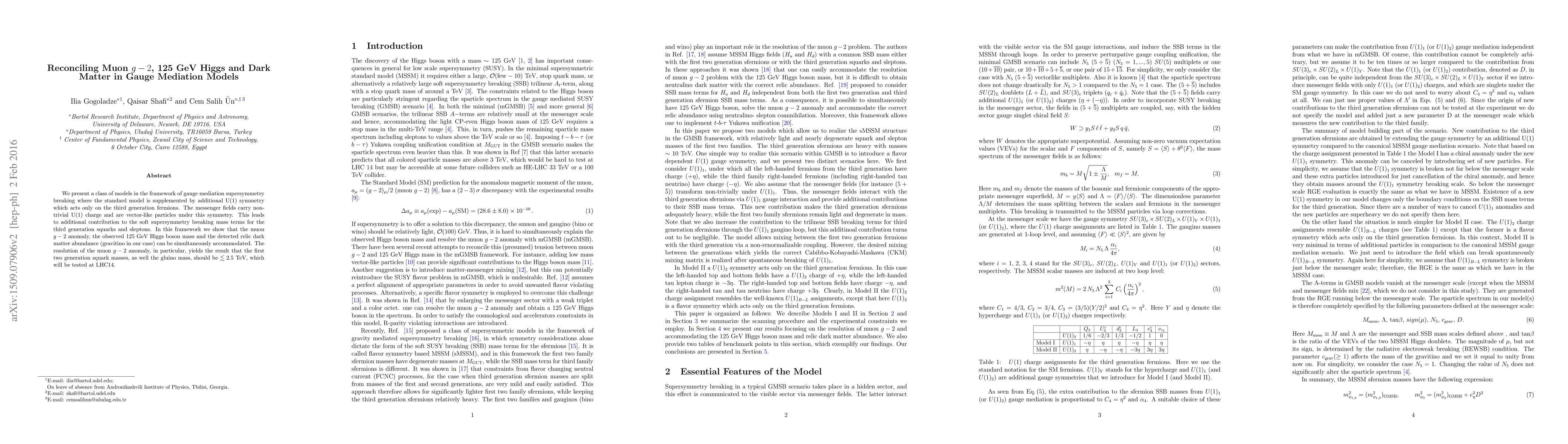 We present a class of models in the framework of gauge mediation supersymmetry breaking where the standard model is supplemented by additional U(1) symmetry which acts only on the third generation fermions. The messenger fields carry non-trivial U(1) charge and are vector-like particles under this symmetry. This leads to additional contribution to the soft supersymmetry breaking mass terms for the third generation squarks and sleptons. In this framework we show that the muon g-2 anomaly, the observed 125 GeV Higgs boson mass and the detected relic dark matter abundance (gravitino in our case) can be simultaneously accommodated. The resolution of the muon g-2 anomaly, in particular, yields the result that the first two generation squark masses, as well the gluino mass, should be <~ 2.5 TeV, which will be tested at LHC14.