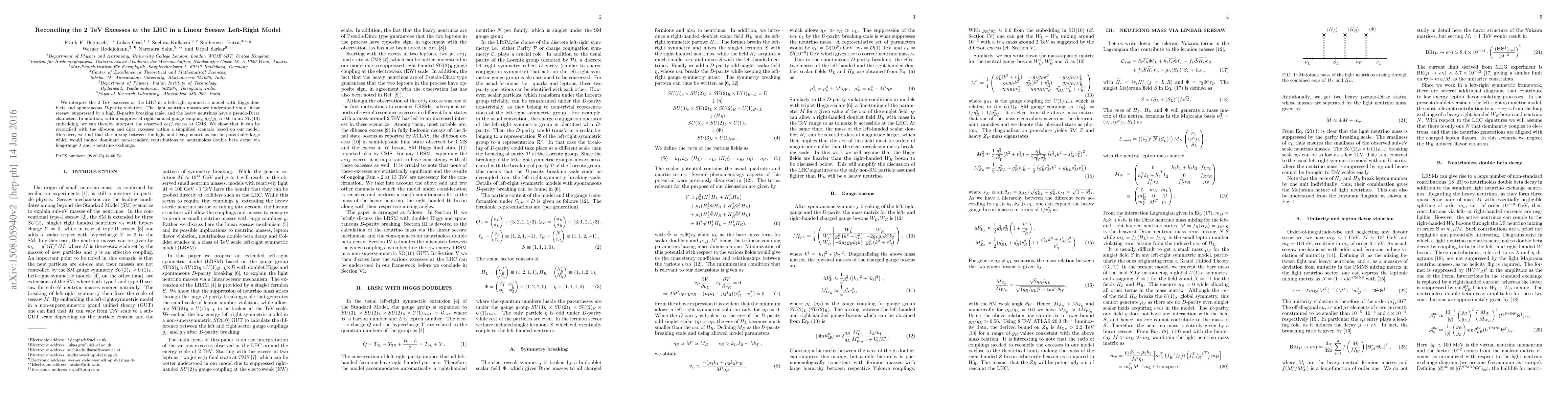 This paper explores the 2 TeV excesses at the LHC within a left-right symmetric model featuring Higgs doublets and a linear seesaw mechanism for light neutrino masses. It reconciles these excesses with a suppressed right-handed gauge coupling and predicts significant mixing between light and heavy neutrinos, potentially impacting neutrinoless double beta decay.