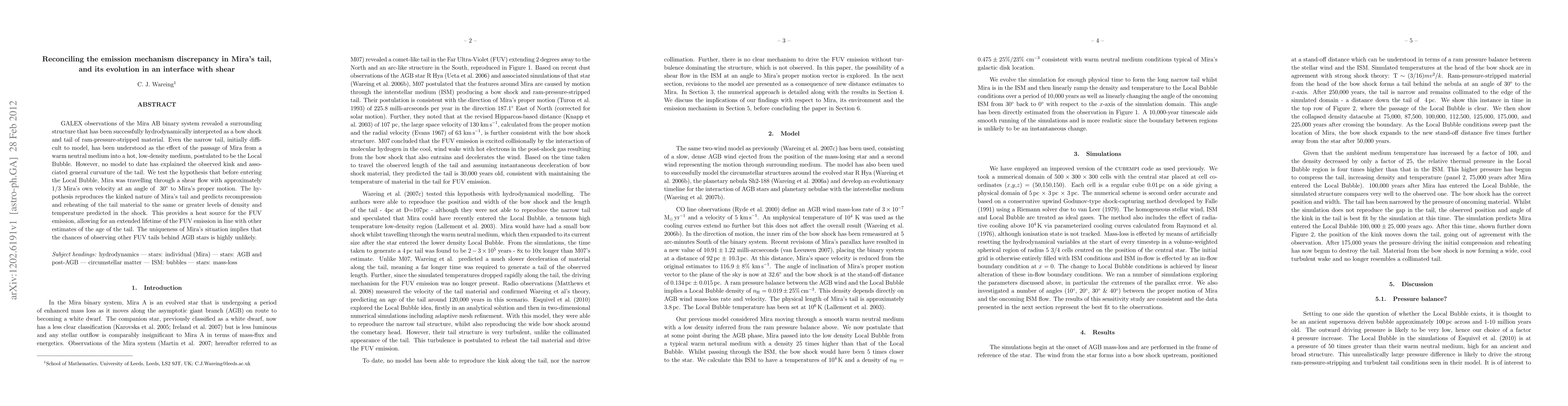 GALEX observations of the Mira AB binary system revealed a surrounding structure that has been successfully hydrodynamically interpreted as a bow shock and tail of ram-pressure-stripped material. Even the narrow tail, initially difficult to model, has been understood as the effect of the passage of Mira from a warm neutral medium into a hot, low-density medium, postulated to be the Local Bubble. However, no model to date has explained the observed kink and associated general curvature of the tail. We test the hypothesis that before entering the Local Bubble, Mira was travelling through a shear flow with approximately 1/3 Mira's own velocity at an angle of ~30degrees to Mira's proper motion. The hypothesis reproduces the kinked nature of Mira's tail and predicts recompression and reheating of the tail material to the same or greater levels of density and temperature predicted in the shock. This provides a heat source for the FUV emission, allowing for an extended lifetime of the FUV emission in line with other estimates of the age of the tail. The uniqueness of Mira's situation implies that the chances of observing other FUV tails behind AGB stars is highly unlikely.