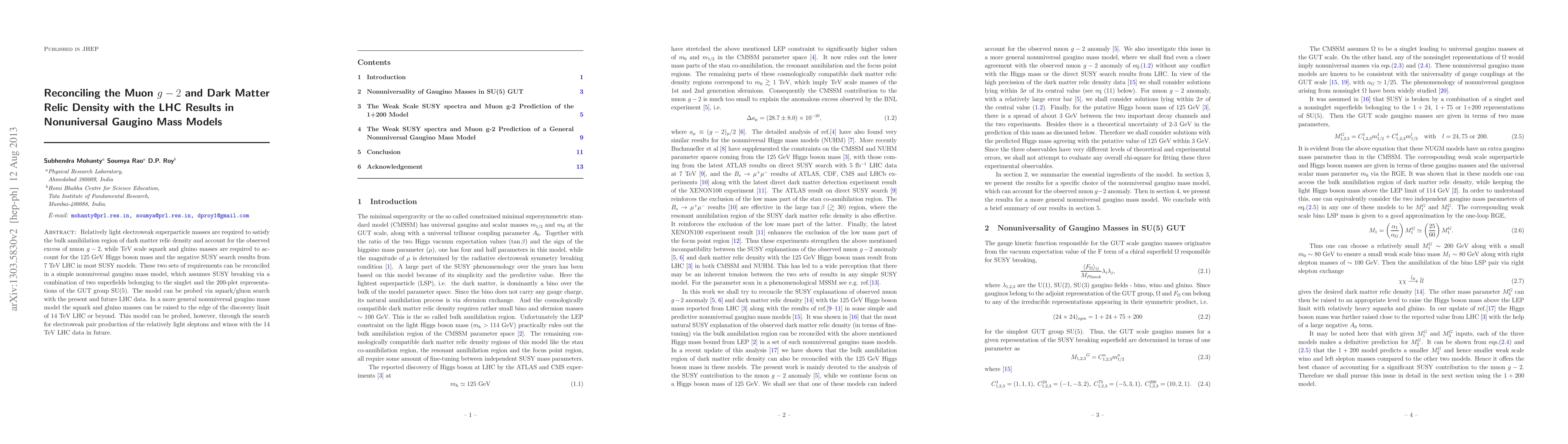 Relatively light electroweak superparticle masses are required to satisfy the bulk annihilation region of dark matter relic density and account for the observed excess of muon g-2, while TeV scale squark and gluino masses are required to account for the 125 GeV Higgs boson mass and the negative SUSY search results from LHC. These two sets of requirements can be reconciled in a simple nonuniversal gaugino mass model, which assumes SUSY breaking via a combination of two superfields belonging to the singlet and the 200-plet representations of the GUT group SU(5). The model can be probed via squark/gluon search with the present and future LHC data. In a more general nonuniversal gaugino mass model the squark and gluino masses can be raised to the edge of the discovery limit of LHC or beyond. This model can be probed, however, through the search for electroweak pair production of the relatively light sleptons and winos with the future LHC data.