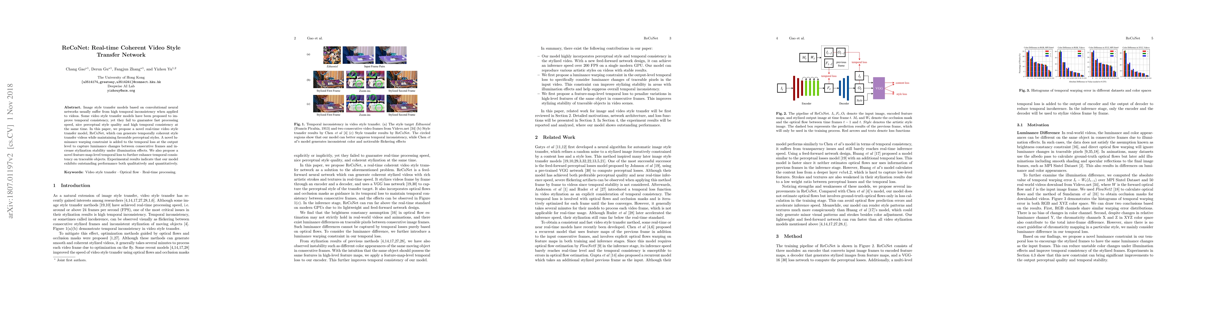 ReCoNet is a novel real-time video style transfer model that achieves temporal coherence and perceptual style quality through a luminance warping constraint and a feature-map-level temporal loss. Experimental results demonstrate its superior performance in both qualitative and quantitative metrics.