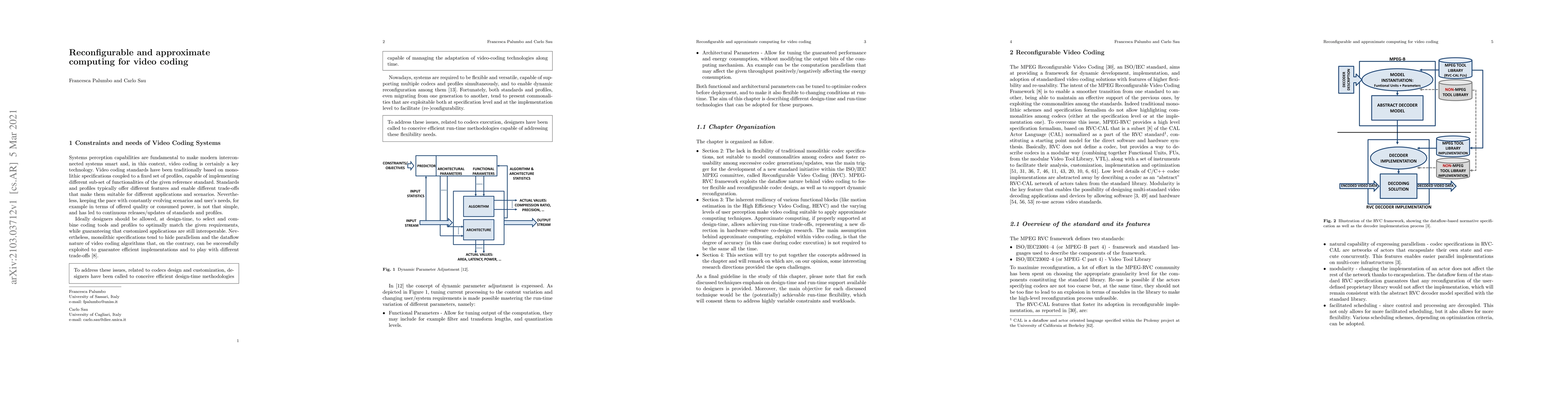 The Chapter begins with a discussion of the constraints and needs of video coding systems. The lack in flexibility of traditional monolithic codec specifications, not suitable to model commonalities among codecs and foster reusability among successive codec generations/updates, was the main trigger for the development of a new standard initiative within the ISO/IEC MPEG committee, called reconfigurable video coding (RVC). The MPEG-RVC framework exploits the dataflow nature behind video coding to foster flexible and reconfigurable codec design, as well as to support dynamic reconfiguration. The Chapter goes on to consider that the inherent resiliency of various functional blocks (like motion estimation in the high-efficiency video coding, HEVC) and the varying levels of user perception make video coding suitable to apply approximate computing techniques. Approximate computing, if properly supported at design time, allows achieving run-time trade-offs, representing a new direction in hardware-software codesign research. The main assumption behind approximate computing, exploited within video coding, is that the degree of accuracy (in this case during codec execution) is not required to be the same all the time. The final part of the Chapter attempts to put together the concepts addressed and remarks on which are, in the authors' opinion, some interesting research directions.