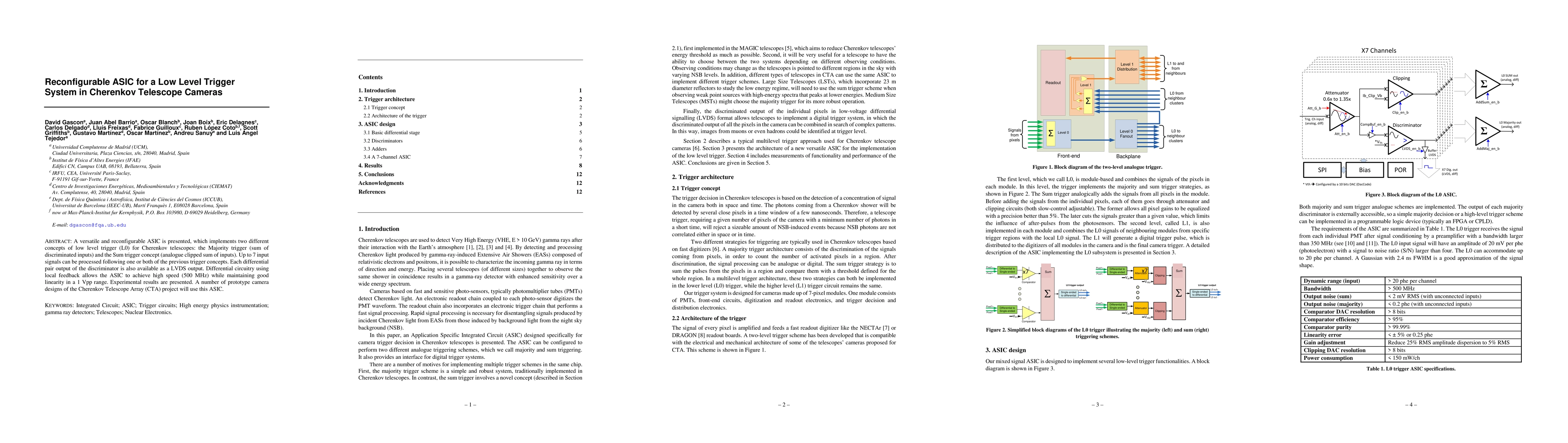 This paper introduces a reconfigurable ASIC designed for low-level triggering in Cherenkov telescope cameras, supporting both Majority and Sum trigger concepts. The ASIC processes up to 7 input signals at high speeds (500 MHz) with good linearity, and is intended for use in the Cherenkov Telescope Array (CTA) project.
