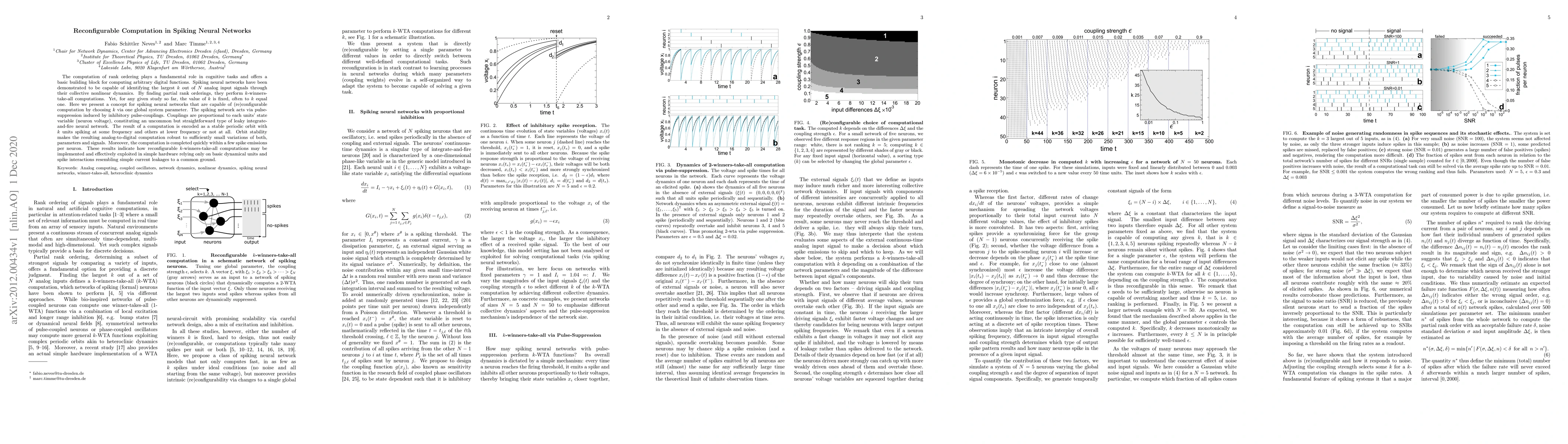 This paper proposes a novel method for reconfigurable computation in spiking neural networks, enabling dynamic selection of k-winners-take-all computations through a global system parameter. The network's computation results in stable periodic orbits, ensuring robust and rapid analog-to-digital conversion.