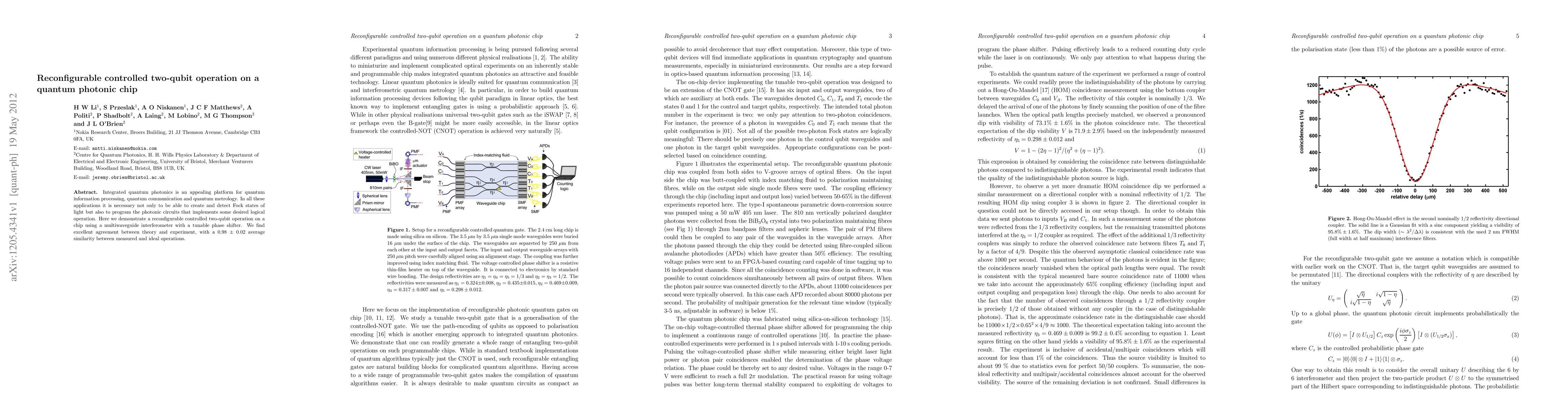This research demonstrates a reconfigurable controlled two-qubit operation on a quantum photonic chip using a tunable multiwaveguide interferometer, achieving high similarity (0.98 ± 0.02) between experimental results and theoretical predictions.