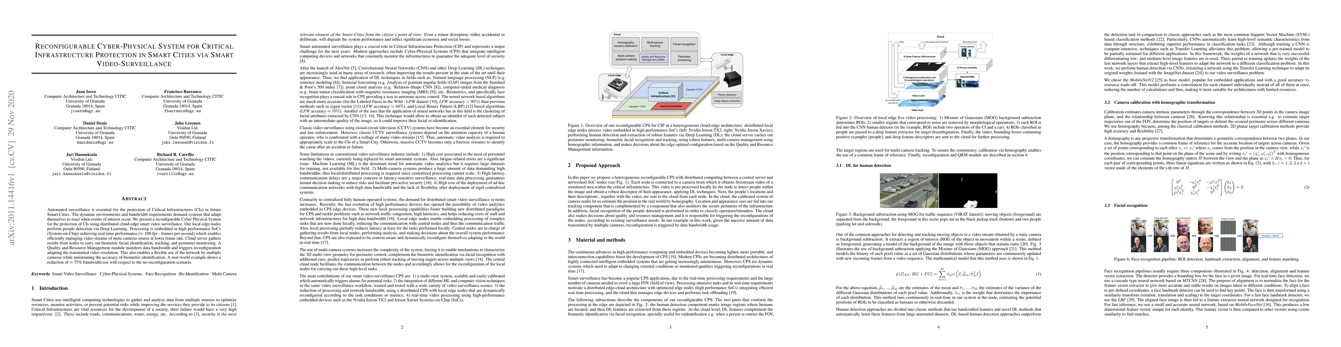 Automated surveillance is essential for the protection of Critical Infrastructures (CIs) in future Smart Cities. The dynamic environments and bandwidth requirements demand systems that adapt themselves to react when events of interest occur. We present a reconfigurable Cyber Physical System for the protection of CIs using distributed cloud-edge smart video surveillance. Our local edge nodes perform people detection via Deep Learning. Processing is embedded in high performance SoCs (System-on-Chip) achieving real-time performance ($\approx$ 100 fps - frames per second) which enables efficiently managing video streams of more cameras source at lower frame rate. Cloud server gathers results from nodes to carry out biometric facial identification, tracking, and perimeter monitoring. A Quality and Resource Management module monitors data bandwidth and triggers reconfiguration adapting the transmitted video resolution. This also enables a flexible use of the network by multiple cameras while maintaining the accuracy of biometric identification. A real-world example shows a reduction of $\approx$ 75\% bandwidth use with respect to the no-reconfiguration scenario.