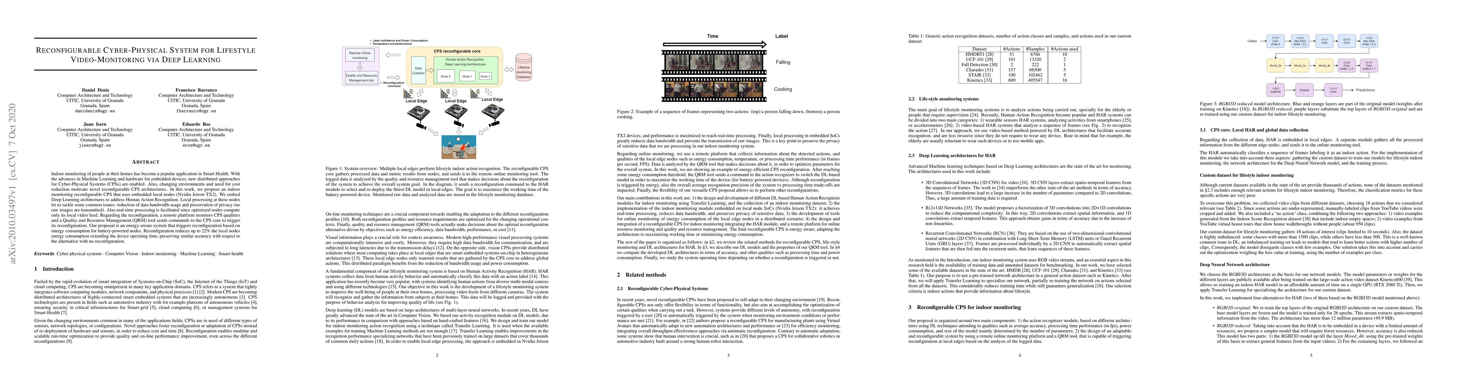Indoor monitoring of people at their homes has become a popular application in Smart Health. With the advances in Machine Learning and hardware for embedded devices, new distributed approaches for Cyber-Physical Systems (CPSs) are enabled. Also, changing environments and need for cost reduction motivate novel reconfigurable CPS architectures. In this work, we propose an indoor monitoring reconfigurable CPS that uses embedded local nodes (Nvidia Jetson TX2). We embed Deep Learning architectures to address Human Action Recognition. Local processing at these nodes let us tackle some common issues: reduction of data bandwidth usage and preservation of privacy (no raw images are transmitted). Also real-time processing is facilitated since optimized nodes compute only its local video feed. Regarding the reconfiguration, a remote platform monitors CPS qualities and a Quality and Resource Management (QRM) tool sends commands to the CPS core to trigger its reconfiguration. Our proposal is an energy-aware system that triggers reconfiguration based on energy consumption for battery-powered nodes. Reconfiguration reduces up to 22% the local nodes energy consumption extending the device operating time, preserving similar accuracy with respect to the alternative with no reconfiguration.