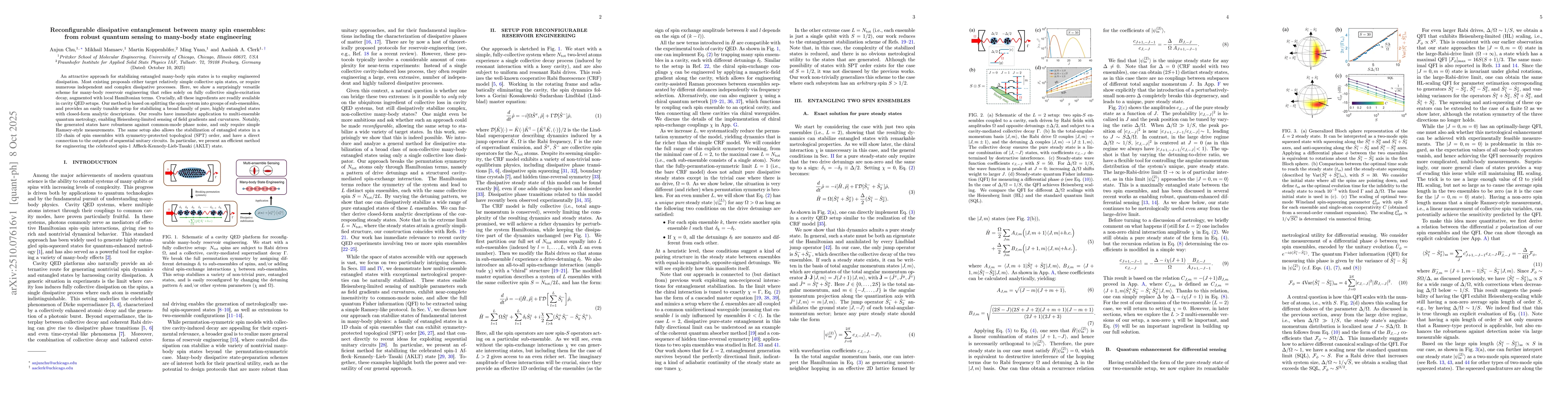 An attractive approach for stabilizing entangled many-body spin states is to employ engineered dissipation. Most existing proposals either target relatively simple collective spin states, or require numerous independent and complex dissipative processes. Here, we show a surprisingly versatile scheme for many-body reservoir engineering that relies solely on fully collective single-excitation decay, augmented with local Hamiltonian terms. Crucially, all these ingredients are readily available in cavity QED setups. Our method is based on splitting the spin system into groups of sub-ensembles, and provides an easily tunable setup for stabilizing a broad family of pure, highly entangled states with closed-form analytic descriptions. Our results have immediate application to multi-ensemble quantum metrology, enabling Heisenberg-limited sensing of field gradients and curvatures. Notably, the generated states have robustness against common-mode phase noise, and only require simple Ramsey-style measurements. The same setup also allows the stabilization of entangled states in a 1D chain of spin ensembles with symmetry-protected topological (SPT) order, and have a direct connection to the outputs of sequential unitary circuits. In particular, we present an efficient method for engineering the celebrated spin-1 Affleck-Kennedy-Lieb-Tasaki (AKLT) state.