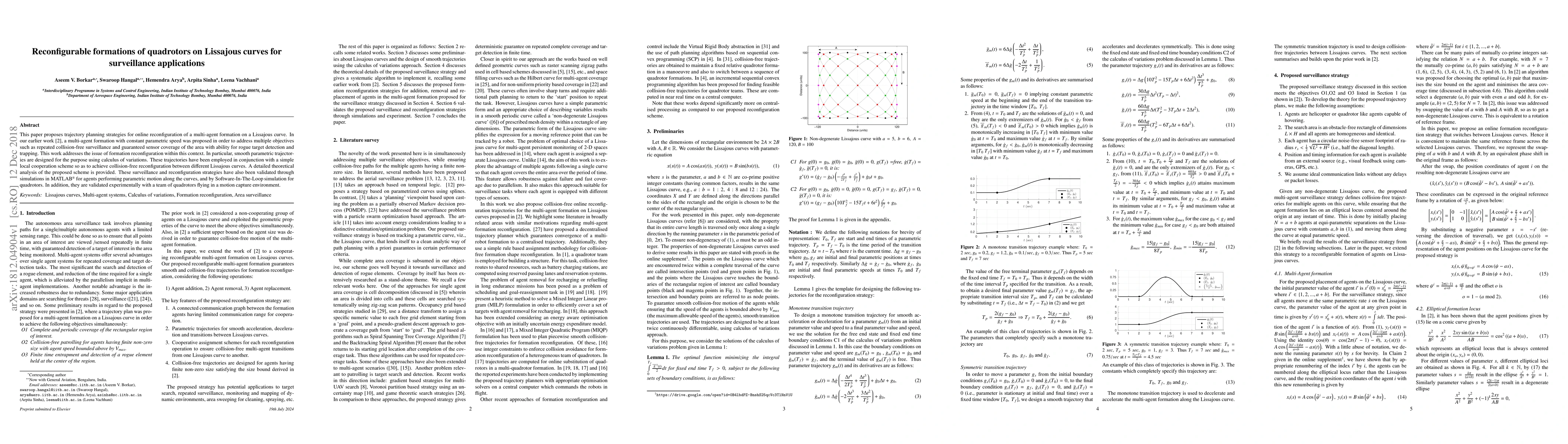 This paper presents trajectory planning for online reconfiguration of quadrotor formations along Lissajous curves, ensuring smooth, collision-free surveillance and sensor coverage. The proposed method uses calculus of variations and local cooperation schemes, validated through simulations and experimental tests with quadrotors.