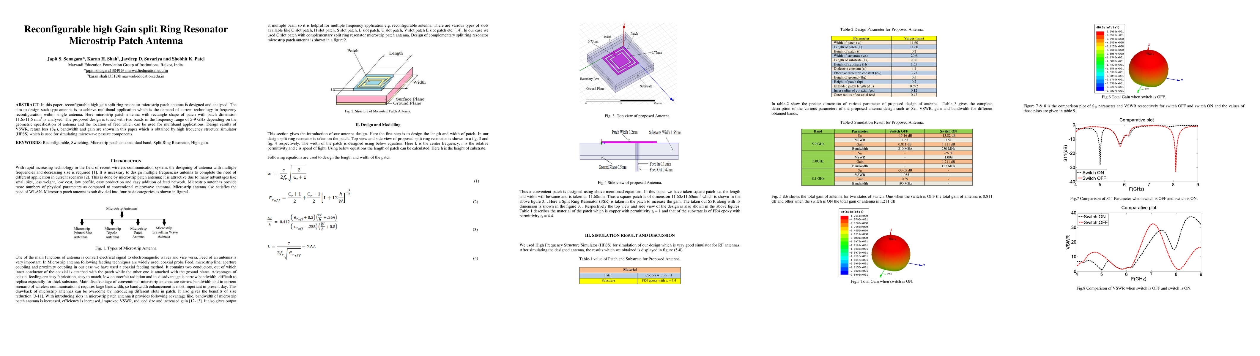 This paper presents a reconfigurable high gain split ring resonator microstrip patch antenna designed for multiband applications, achieving frequency reconfiguration within a single antenna. The antenna, with dimensions 11.6 x 11.6 mm², is simulated using HFSS to demonstrate VSWR, return loss, bandwidth, and gain across a 5-9 GHz range.