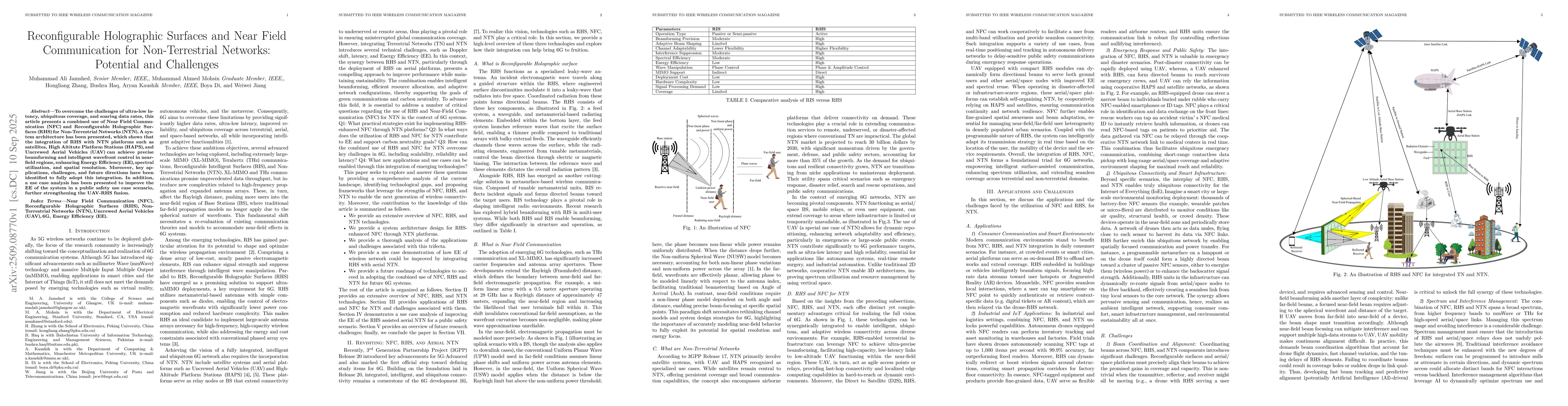 To overcome the challenges of ultra-low latency, ubiquitous coverage, and soaring data rates, this article presents a combined use of Near Field Communication (NFC) and Reconfigurable Holographic Surfaces (RHS) for Non-Terrestrial Networks (NTN). A system architecture has been presented, which shows that the integration of RHS with NTN platforms such as satellites, High Altitute Platform Stations (HAPS), and Uncrewed Aerial Vehicles (UAV) can achieve precise beamforming and intelligent wavefront control in near-field regions, enhancing Energy Efficiency (EE), spectral utilization, and spatial resolution. Moreover, key applications, challenges, and future directions have been identified to fully adopt this integration. In addition, a use case analysis has been presented to improve the EE of the system in a public safety use case scenario, further strengthening the UAV-RHS fusion.