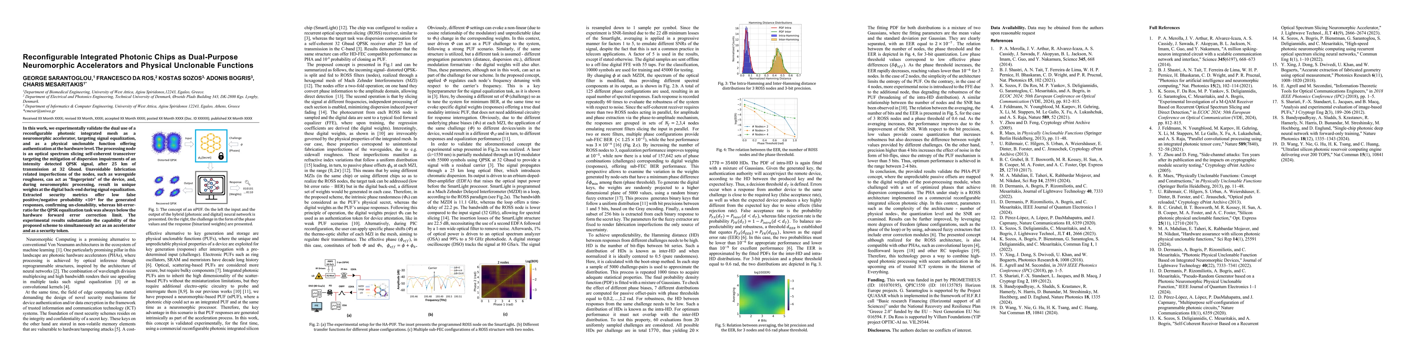 The research employs a reconfigurable photonic integrated mesh to demonstrate dual functionality as a neuromorphic accelerator for signal equalization and as a physical unclonable function (PUF) for hardware-level authentication.