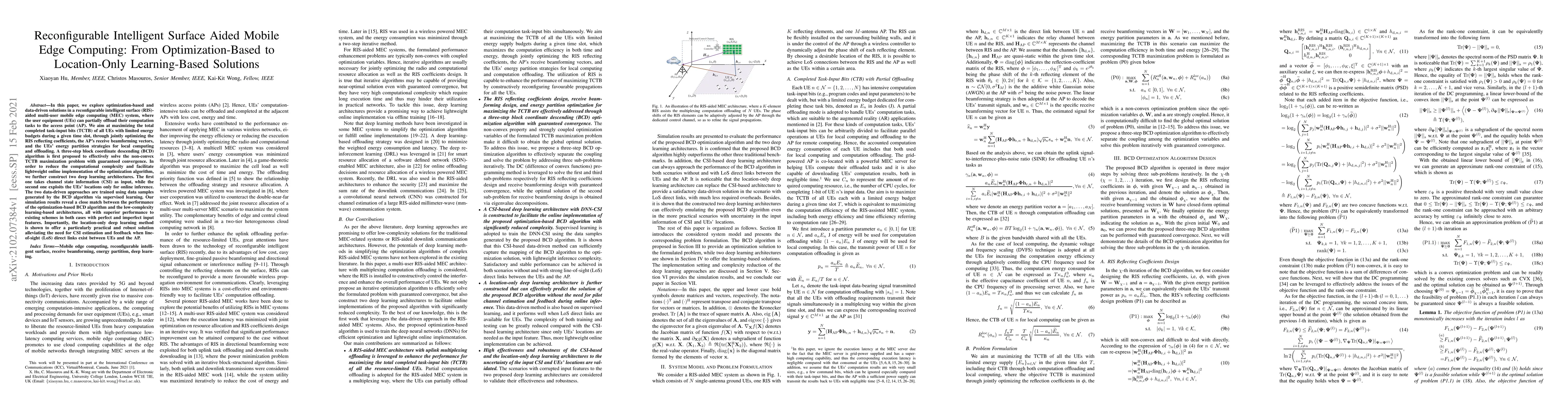 This paper investigates optimization-based and data-driven solutions for a RIS-aided multi-user mobile edge computing system, proposing a BCD algorithm for task optimization and two deep learning models, one using channel state information and another leveraging location-only data, demonstrating their superior performance over existing methods.