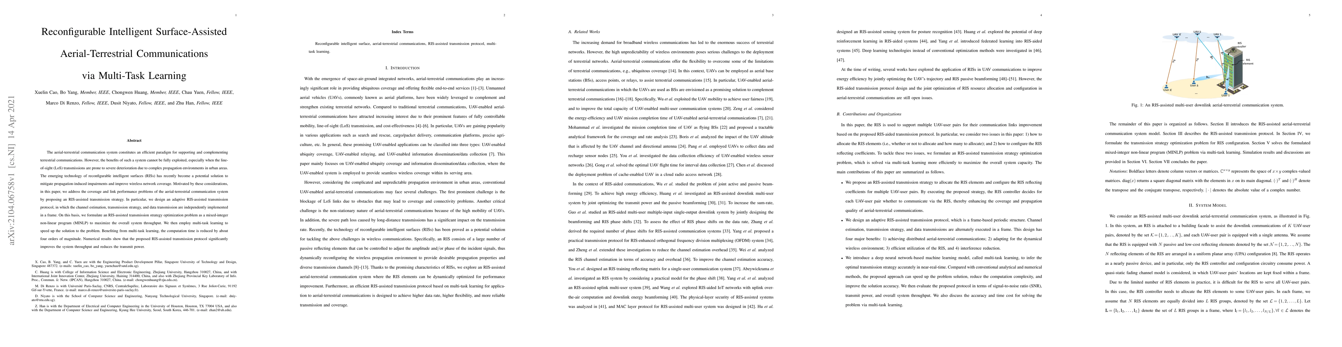 This paper proposes an adaptive reconfigurable intelligent surface (RIS)-assisted transmission protocol to enhance aerial-terrestrial communication systems, addressing coverage and link performance issues. It employs multi-task learning to solve an optimization problem, significantly reducing computation time and improving system throughput.