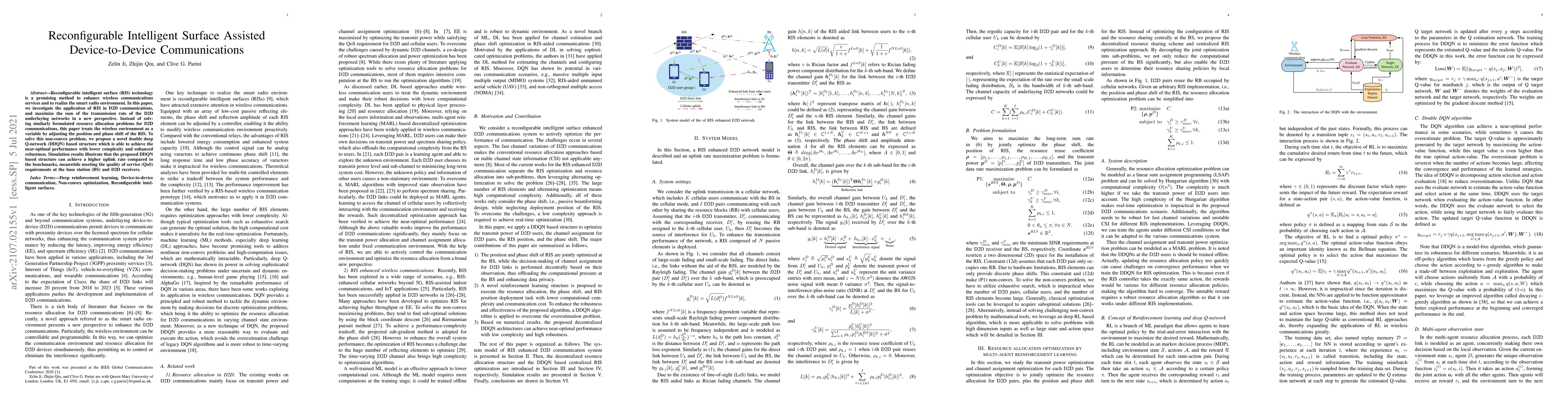 This paper explores the use of reconfigurable intelligent surfaces (RIS) to enhance device-to-device (D2D) communications by adjusting the wireless environment's position and phase shift. A novel double deep Q-network (DDQN) based structure is proposed to achieve near-optimal performance with lower complexity, resulting in higher uplink rates and meeting QoS requirements.