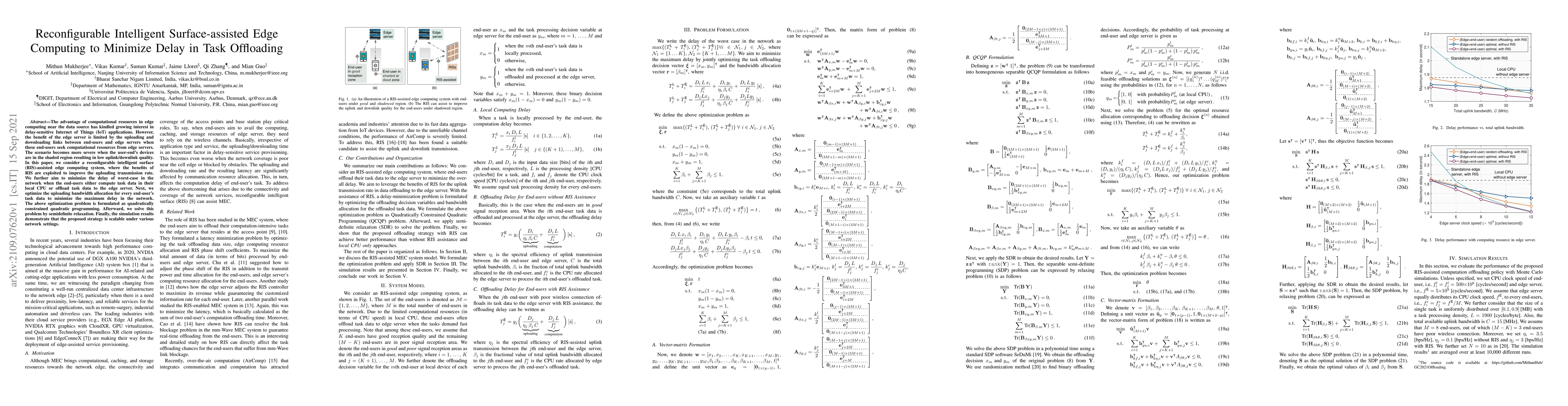This paper explores a reconfigurable intelligent surface (RIS)-assisted edge computing system to enhance the uploading transmission rate and minimize task offloading delay in delay-sensitive IoT applications. The proposed optimization strategy, solved via semidefinite relaxation, effectively reduces maximum delay, as demonstrated by scalable simulation results.