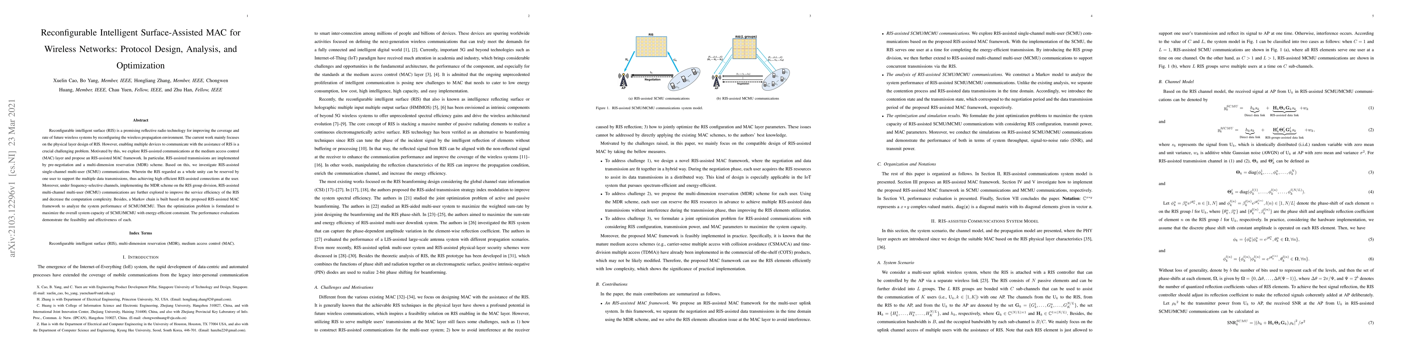 This paper proposes an RIS-assisted MAC framework to enhance wireless communication efficiency by utilizing reconfigurable intelligent surfaces for multi-user transmissions. The framework includes a multi-dimension reservation scheme for optimizing single-channel and multi-channel multi-user communications, and a Markov chain model is used to analyze system performance, followed by optimization to maximize capacity under energy constraints.
