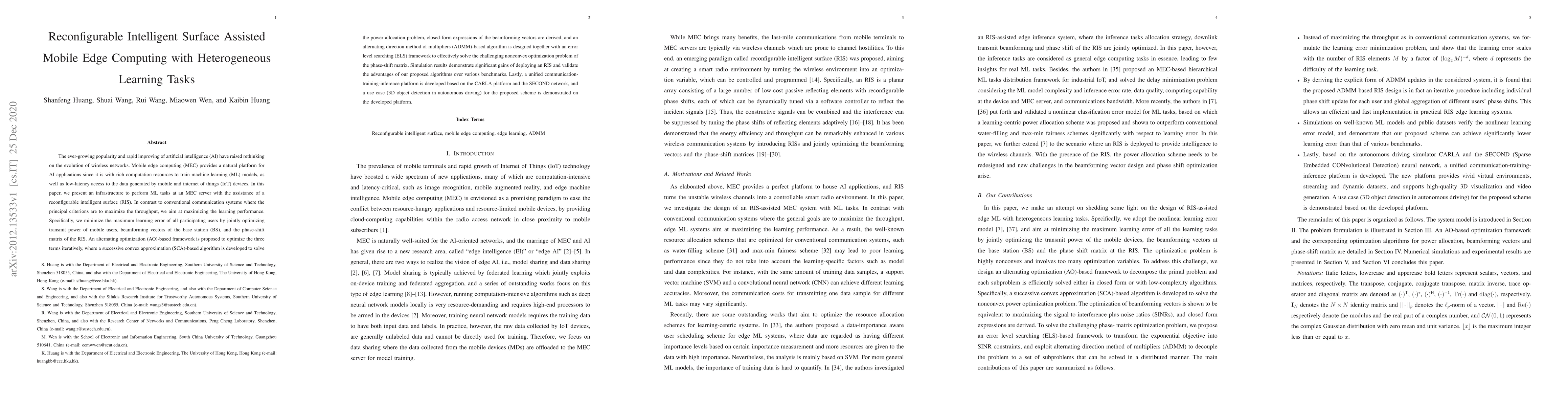 This paper proposes an infrastructure for mobile edge computing (MEC) that leverages reconfigurable intelligent surfaces (RIS) to enhance machine learning tasks. It optimizes transmit power, beamforming vectors, and phase-shift matrices to minimize maximum learning error, using an alternating optimization framework with algorithms for power allocation, beamforming, and phase-shift matrix optimization. Simulation results show significant performance gains and a demonstration of 3D object detection in autonomous driving on a developed platform.