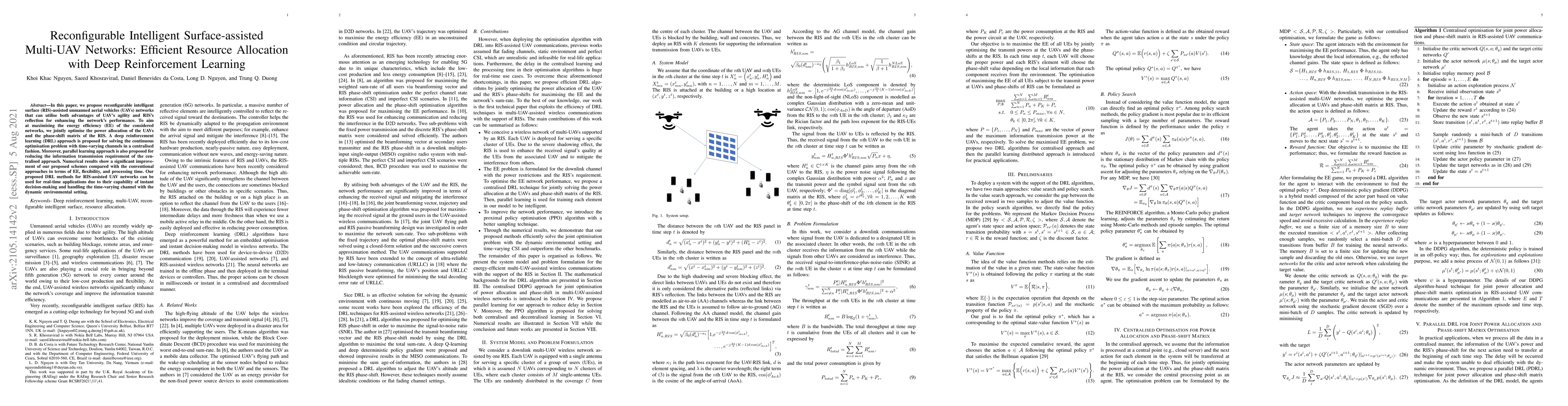 This paper proposes a reconfigurable intelligent surface (RIS)-assisted multi-UAV network that leverages both UAV agility and RIS reflection for enhanced network performance. A deep reinforcement learning (DRL) approach is developed to optimise power allocation and phase-shift matrix for maximising energy efficiency, with a parallel learning method reducing information transmission requirements.