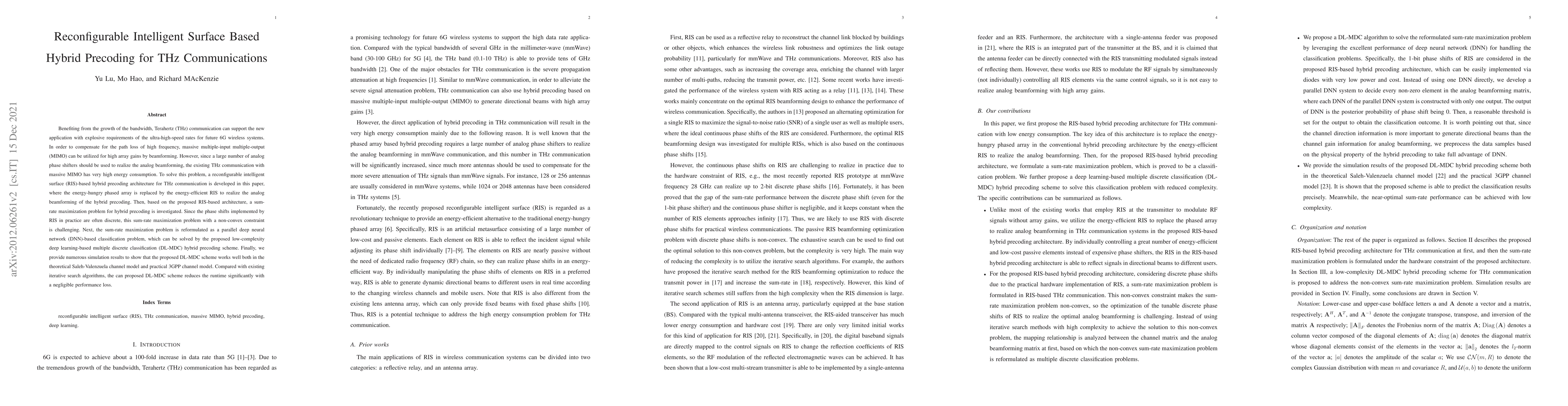 This paper proposes a reconfigurable intelligent surface (RIS)-based hybrid precoding architecture to address high energy consumption in THz communication systems. The RIS replaces energy-hungry phased arrays, enabling efficient analog beamforming. A deep learning-based multiple discrete classification (DL-MDC) scheme is introduced to solve the non-convex sum-rate maximization problem, significantly reducing runtime with minimal performance loss compared to iterative search algorithms.