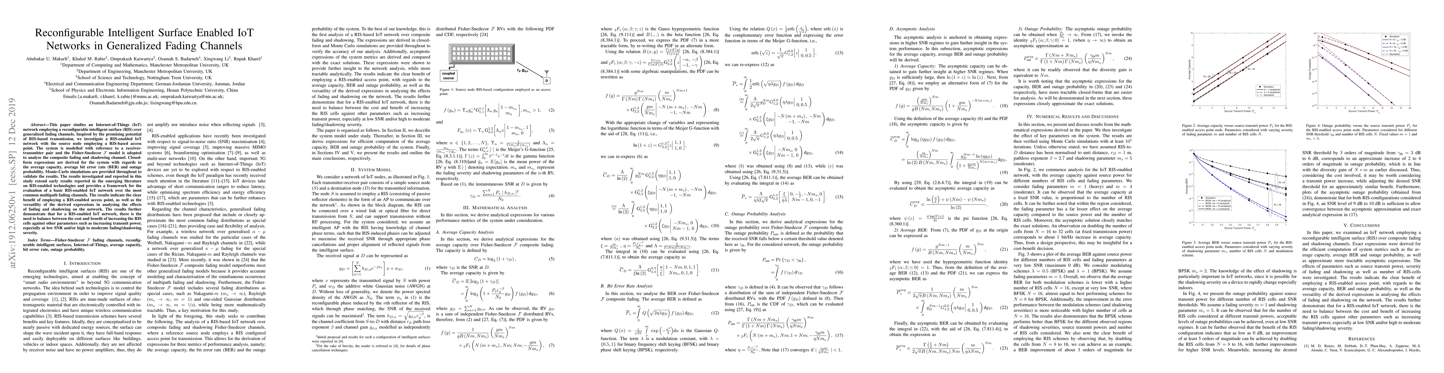 This paper investigates a reconfigurable intelligent surface (RIS)-enabled IoT network over generalized fading channels, deriving closed-form expressions for average capacity, BER, and outage probability. The results highlight the benefits of RIS-enabled access points and the need to balance RIS cell deployment against transmit power, especially under low SNR and high fading/shadowing conditions.