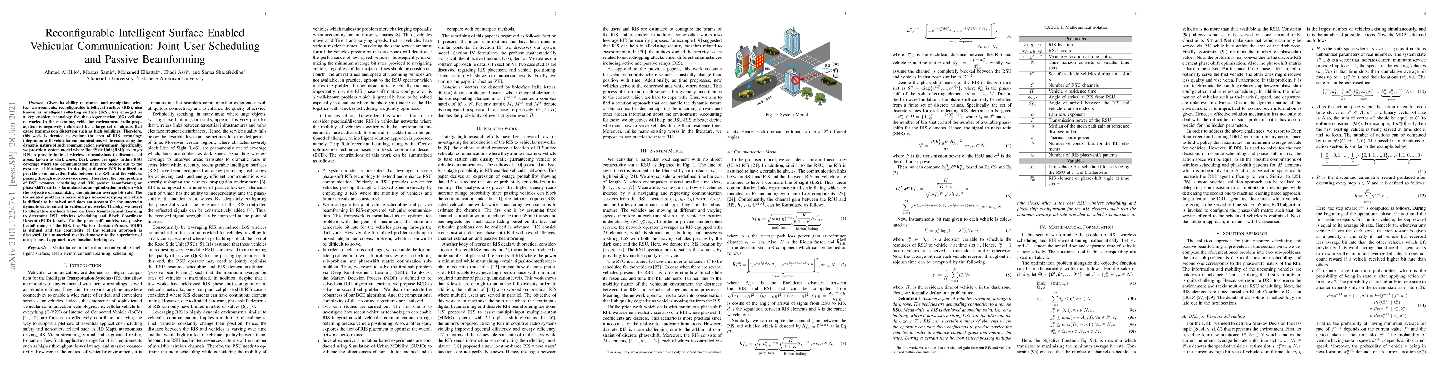 Given its ability to control and manipulate wireless environments, reconfigurable intelligent surface (RIS), also known as intelligent reflecting surface (IRS), has emerged as a key enabler technology for the six-generation (6G) cellular networks. In the meantime, vehicular environment radio propagation is negatively influenced by a large set of objects that cause transmission distortion such as high buildings. Therefore, this work is devoted to explore the area of RIS technology integration with vehicular communications while considering the dynamic nature of such communication environment. Specifically, we provide a system model where RoadSide Unit (RSU) leverages RIS to provide indirect wireless transmissions to disconnected areas, known as dark zones. Dark zones are spots within RSU coverage where the communication links are blocked due to the existence of blockages. In details, a discrete RIS is utilized to provide communication links between the RSU and the vehicles passing through out-of-service zones. Therefore, the joint problem of RSU resource scheduling and RIS passive beamforming or phase-shift matrix is formulated as an optimization problem with the objective of maximizing the minimum average bit rate. The formulated problem is mixed integer non-convex program which is difficult to be solved and does not account for the uncertain dynamic environment in vehicular networks. Thereby, we resort to alternative methods based on Deep Reinforcement Learning to determine RSU wireless scheduling and Block Coordinate Descent (BCD) to solve for the phase-shift matrix, \textit{i.e.,} passive beamforming, of the RIS. The Markov Decision Process (MDP) is defined and the complexity of the solution approach is discussed. Our numerical results demonstrate the superiority of our proposed approach over baseline techniques.