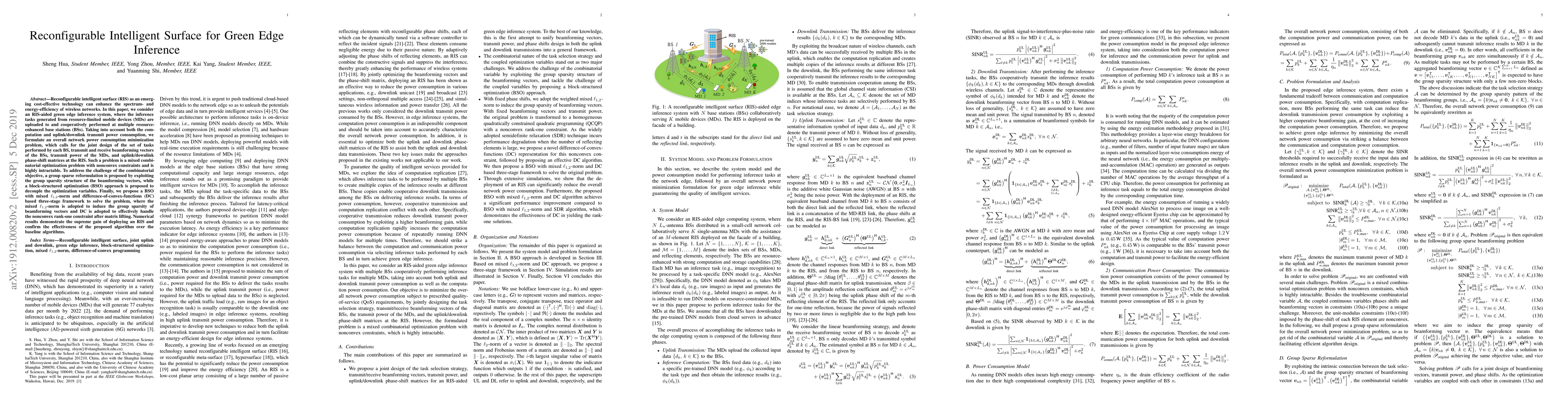 Reconfigurable intelligent surface (RIS) as an emerging cost-effective technology can enhance the spectrum- and energy-efficiency of wireless networks. In this paper, we consider an RIS-aided green edge inference system, where the inference tasks generated from resource-limited mobile devices (MDs) are uploaded to and cooperatively performed at multiple resource-enhanced base stations (BSs). Taking into account both the computation and uplink/downlink transmit power consumption, we formulate an overall network power consumption minimization problem, which calls for the joint design of the set of tasks performed by each BS, transmit and receive beamforming vectors of the BSs, transmit power of the MDs, and uplink/downlink phase-shift matrices at the RIS. Such a problem is a mixed combinatorial optimization problem with nonconvex constraints and is highly intractable. To address the challenge of the combinatorial objective, a group sparse reformulation is proposed by exploiting the group sparsity structure of the beamforming vectors, while a block-structured optimization (BSO) approach is proposed to decouple the optimization variables. Finally, we propose a BSO with mixed $\ell_{1,2}$-norm and difference-of-convex-functions (DC) based three-stage framework to solve the problem, where the mixed $\ell_{1,2}$-norm is adopted to induce the group sparsity of beamforming vectors and DC is adopted to effectively handle the nonconvex rank-one constraint after matrix lifting. Numerical results demonstrate the supreme gain of deploying an RIS and confirm the effectiveness of the proposed algorithm over the baseline algorithms.