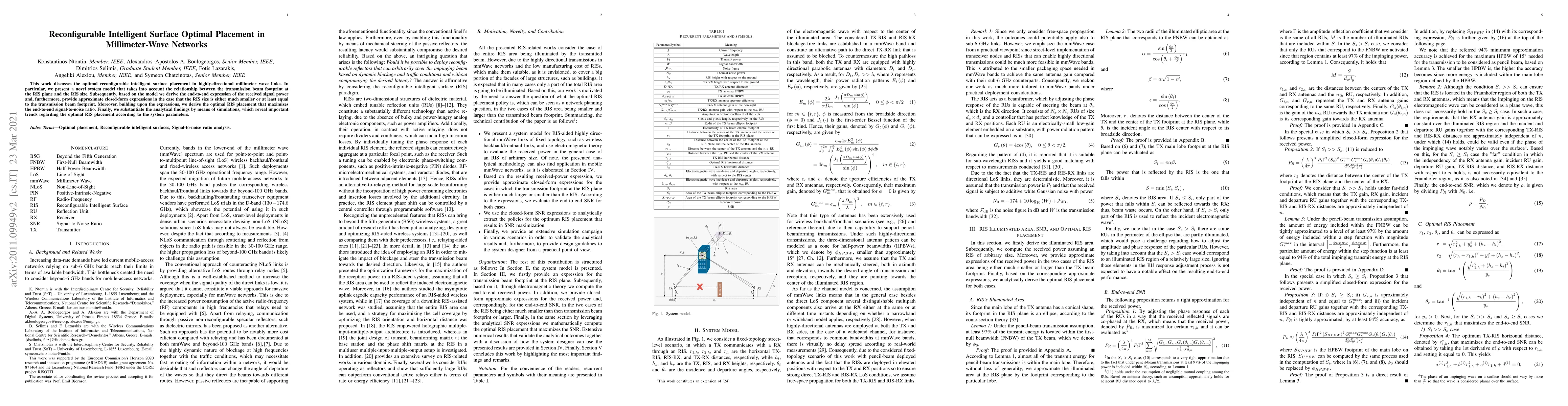 This paper proposes a novel system model for optimal placement of reconfigurable intelligent surfaces (RIS) in millimeter-wave networks, deriving expressions for received signal power and optimal RIS placement to maximize signal-to-noise ratio, validated through simulations.