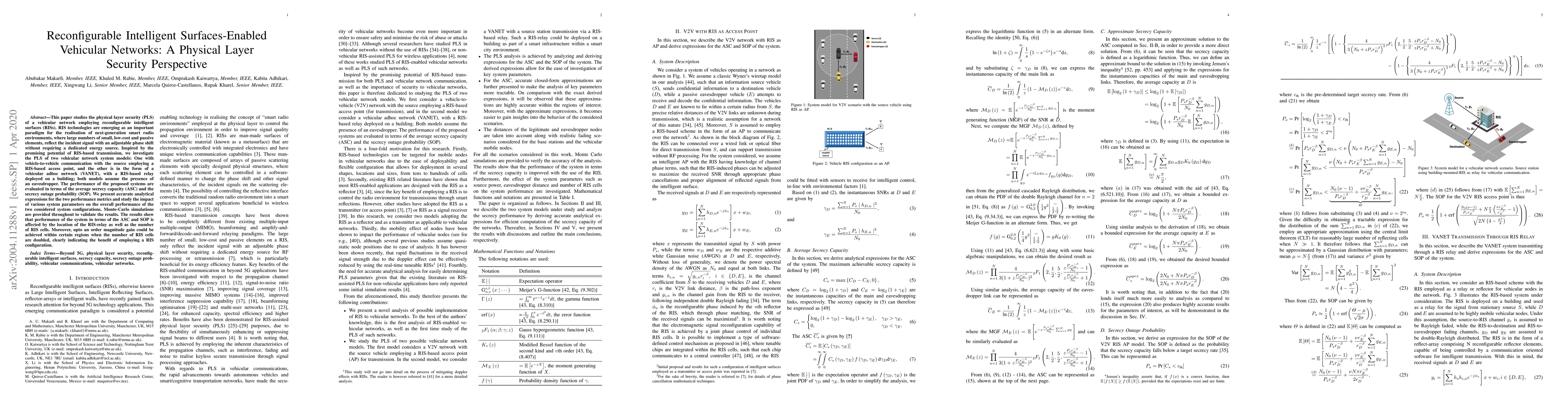 This paper studies the physical layer security (PLS) of a vehicular network employing reconfigurable intelligent surfaces (RISs). RIS technologies are emerging as an important paradigm for the realisation of next-generation smart radio environments, where large numbers of small, low-cost and passive elements, reflect the incident signal with an adjustable phase shift without requiring a dedicated energy source. Inspired by the promising potential of RIS-based transmission, we investigate the PLS of two vehicular network system models: One with vehicle-to-vehicle communication with the source employing a RIS-based access point, and the other is in the form of a vehicular adhoc network (VANET), with a RIS-based relay deployed on a building; both models assume the presence of an eavesdropper. The performance of the proposed systems are evaluated in terms of the average secrecy capacity (ASC) and the secrecy outage probability (SOP). We present accurate analytical expressions for the two performance metrics and study the impact of various system parameters on the overall performance of the two considered system configurations. Monte-Carlo simulations are provided throughout to validate the results. The results show that performance of the system in terms of the ASC and SOP is affected by the location of the RIS-relay as well as the number of RIS cells. Moreover, upto an order magnitude gain could be achieved within certain regions when the number of RIS cells are doubled, clearly indicating the benefit of employing a RIS configuration.