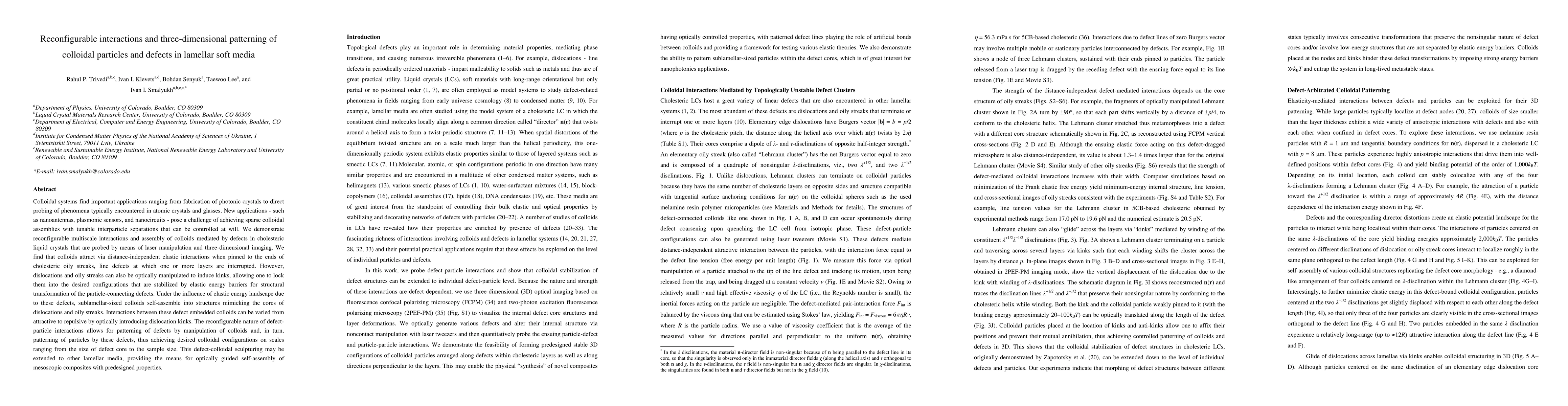 This paper demonstrates the reconfigurable assembly of colloidal particles in cholesteric liquid crystals using defects as mediators. By manipulating these defects with laser, the interactions between colloids can be tuned from attractive to repulsive, enabling precise three-dimensional patterning and self-assembly of colloidal structures on various scales.