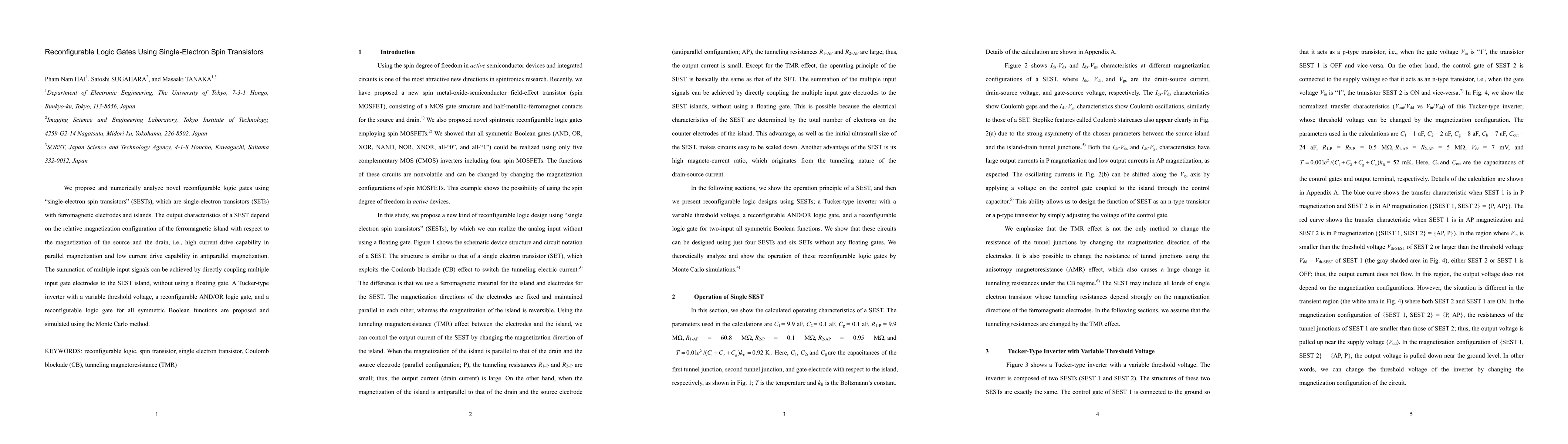 This paper proposes reconfigurable logic gates using single-electron spin transistors (SESTs), which leverage the magnetization configuration of ferromagnetic electrodes to control output characteristics. The study simulates various logic gates, including inverters, AND/OR gates, and symmetric Boolean functions, using the Monte Carlo method.