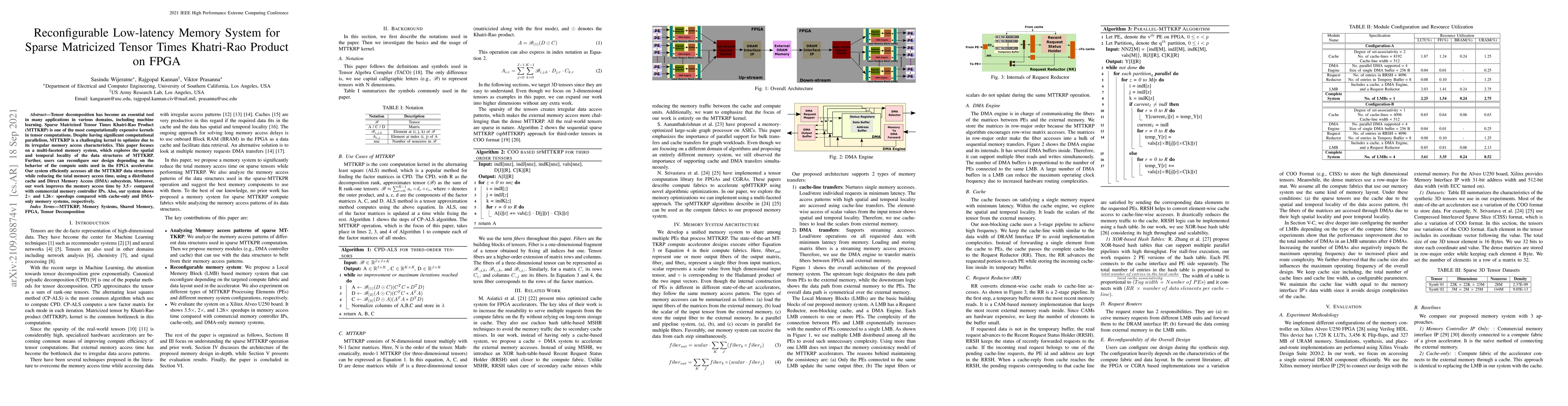 This paper presents a reconfigurable low-latency memory system for optimizing the computationally expensive Sparse Matricized Tensor Times Khatri-Rao Product (MTTKRP) on FPGA. The system leverages distributed cache and DMA to enhance memory access efficiency, achieving a 3.5x improvement over commercial memory controllers and demonstrating significant speedups over cache-only and DMA-only approaches.