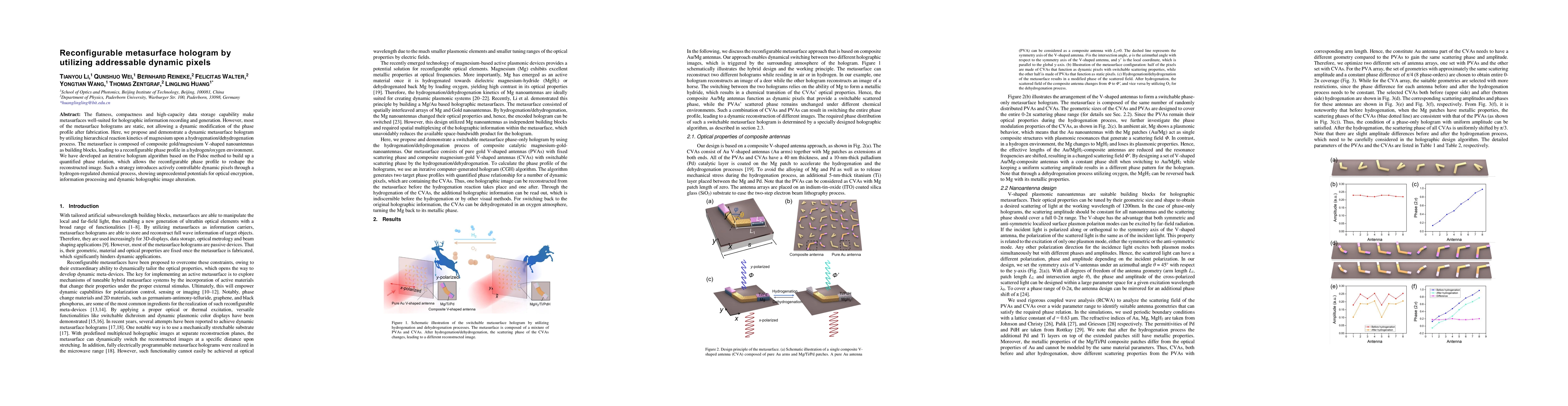 This paper proposes a dynamic metasurface hologram utilizing magnesium's hydrogenation/dehydrogenation process for reconfigurable phase profiles, enabling active control of holographic images. The approach uses gold/magnesium nanoantennas and an iterative algorithm to achieve dynamic pixel modification, promising applications in optical encryption and information processing.