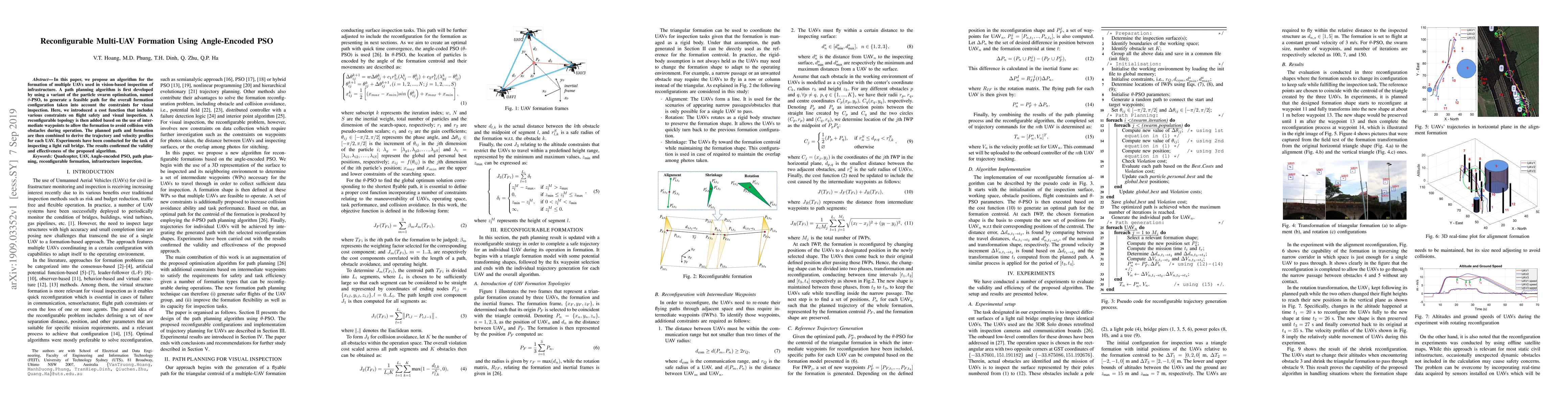 This paper proposes an angle-encoded particle swarm optimisation (theta-PSO) algorithm for path planning in multi-UAV formations for vision-based infrastructure inspection. The algorithm incorporates safety and inspection constraints, and a reconfigurable topology to avoid collisions, demonstrating effectiveness through experiments on a light rail bridge.