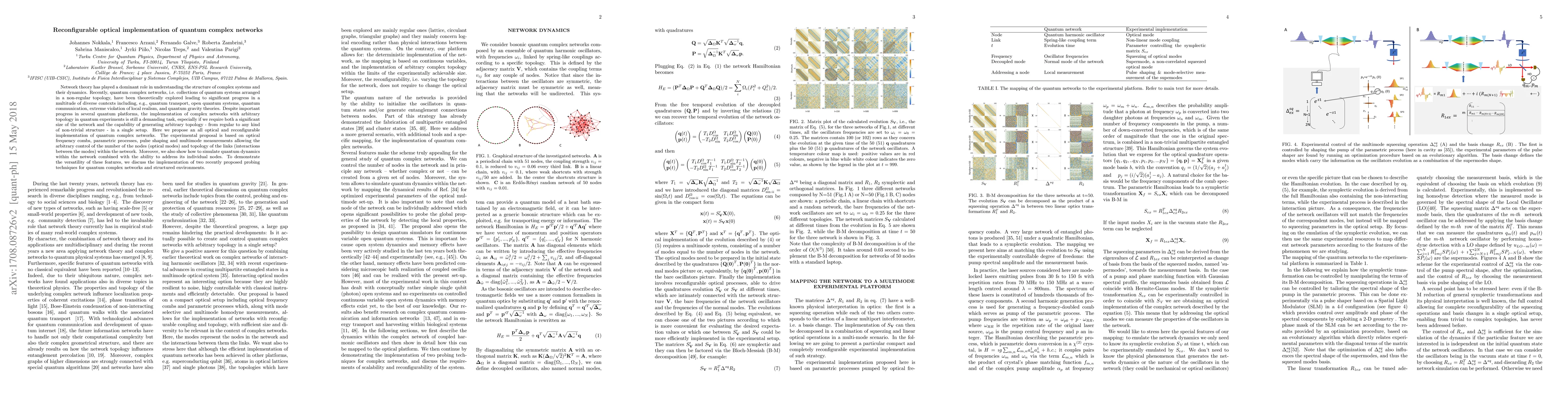 This paper proposes an all-optical, reconfigurable method for implementing quantum complex networks using optical frequency combs, parametric processes, and multimode measurements. The approach allows for the arbitrary control of network nodes and topology, enabling simulations of quantum dynamics and addressing individual nodes, with potential applications across various quantum physical frameworks.