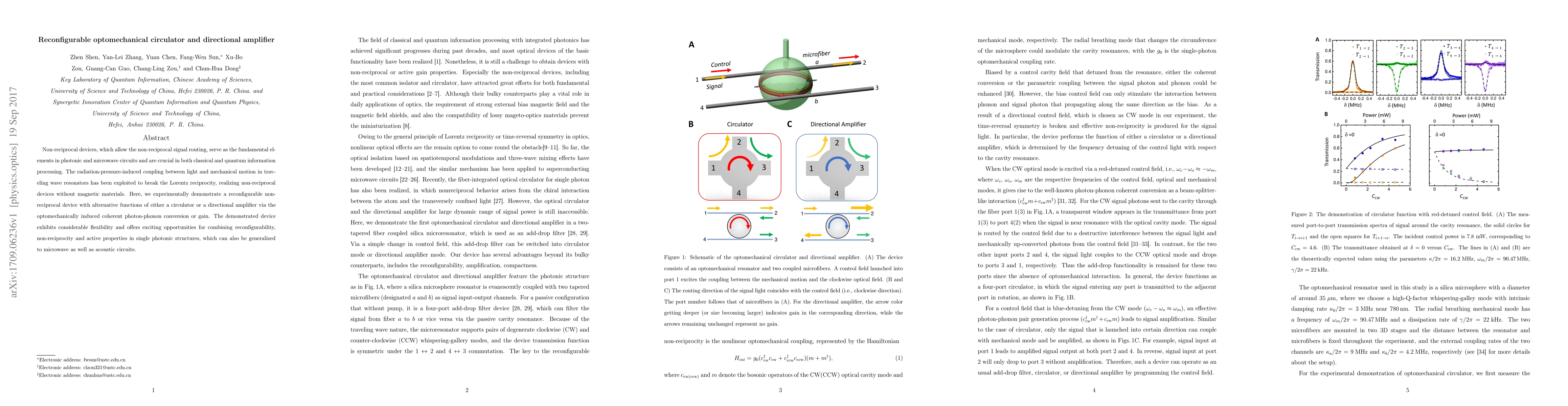 This paper demonstrates a reconfigurable optomechanical circulator and directional amplifier that leverages radiation-pressure-induced coupling between light and mechanical motion to achieve non-reciprocal signal routing without magnetic materials, offering flexibility and potential for integration in photonic, microwave, and acoustic circuits.