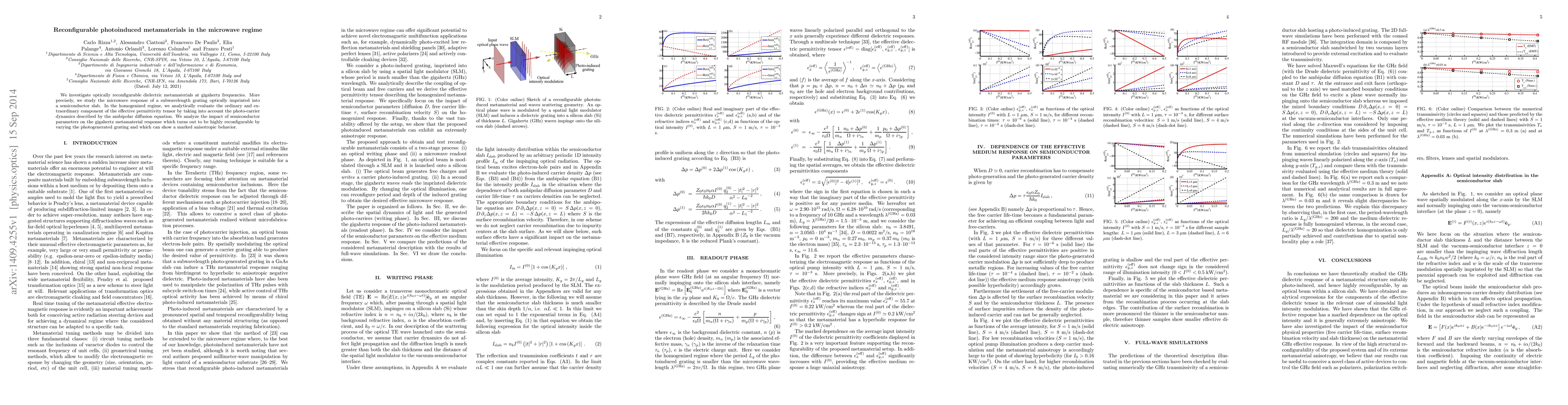 We investigate optically reconfigurable dielectric metamaterials at gigahertz frequencies. More precisely, we study the microwave response of a subwavelength grating optically imprinted into a semiconductor slab. In the homogenized regime, we analytically evaluate the ordinary and extraordinary component of the effective permittivity tensor by taking into account the photo-carrier dynamics described by the ambipolar diffusion equation. We analyze the impact of semiconductor parameters on the gigahertz metamaterial response which turns out to be highly reconfigurable by varying the photogenerated grating and which can show a marked anisotropic behavior.